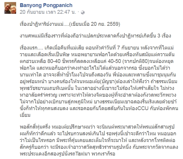 Bunchar Pongpanich ในฐานะกรรมการและเลขานุการ และผู้อำนวยการ มูลนิธิหอจดหมายเหตุพุทธทาส อินทปัญโญ ขอชี้แจงตามที่ผู้จัดการหอจดหมายเหตุฯ รายงานและหารือดังนี้ เมื่อเช้าวันที่ ๒๐ กย. ที่ยอดรวม ๒,๙๙๙,๐๐๐ บาทนั้น ผมก็สงสัยว่าถูกต้องหรือ ? ด้วยรู้อยู่ว่าเราคุยกันที่บ้านเล่น ๆ ว่า งานนี้สงสัยจะได้ทำบุญให้หอฯ สัก ๓ ล้านบาท ถ้าถึงก็ดี ตอนเย็น อ.จินตนีย์ จากวลัยลักษณ์ เข้าไปที่หอฯ เอาซองที่มีผู้ฝากทำบุญมาให้อีก ๑ ซอง ผมก็เลยถามฝ่ายบัญชีว่า เมื่อเช้า ๒,๙๙๙,๐๐๐ ถูกต้องแล้วไหม ? ถึงตอนนี้มีเพิ่มเท่าไหร่ ? คำตอบคือ ซองนี้ ๑,๐๐๐ บาท ก็ ๓,๐๐๐,๐๐๐ บาท พอดี ผมก็บอกว่างั้นก็พอ ปิดบัญชีได้เลย เพื่อที่เหลือจากนี้ ให้เอาไปสมทบทำบุญที่เมืองนคร จะให้วัดศรีทวี สำหรับสวนโมกข์กรุงเทพได้ระดับนี้น่าจะพอแล้ว พอกลับมาบ้าน กินข้าวกับพี่ ๆ ก็บอกเรื่องนี้ พี่ตั้วสงสัย ให้โทรไปสอบถามใหม่ จึงได้รับแจ้งว่า เพิ่งมีคนทำบุญเข้ามาอีกราย ๑,๐๐๐ บาท ทำให้เป็น ๓,๐๐๑,๐๐๐ บาท อย่างนี้ต้องเอาเข้าที่ประชุมใหญ่กรรมการมูลนิธิวินิจฉัยไหมนี่ ?