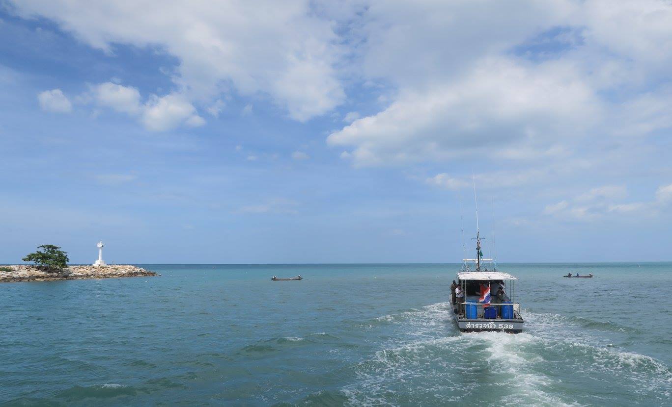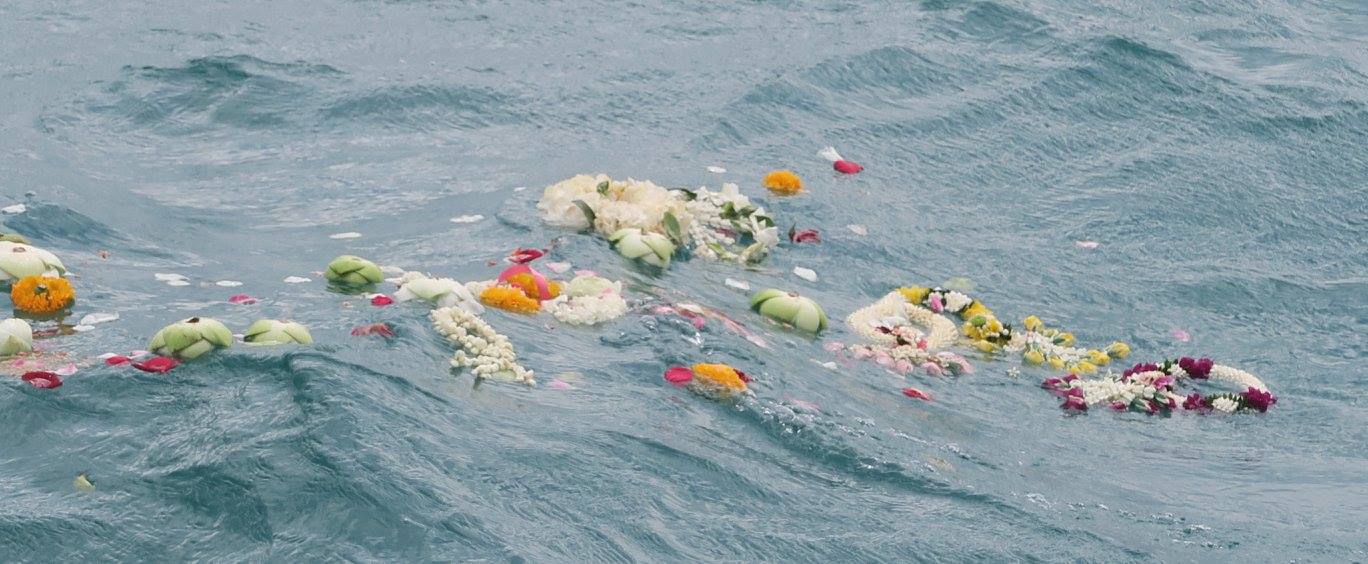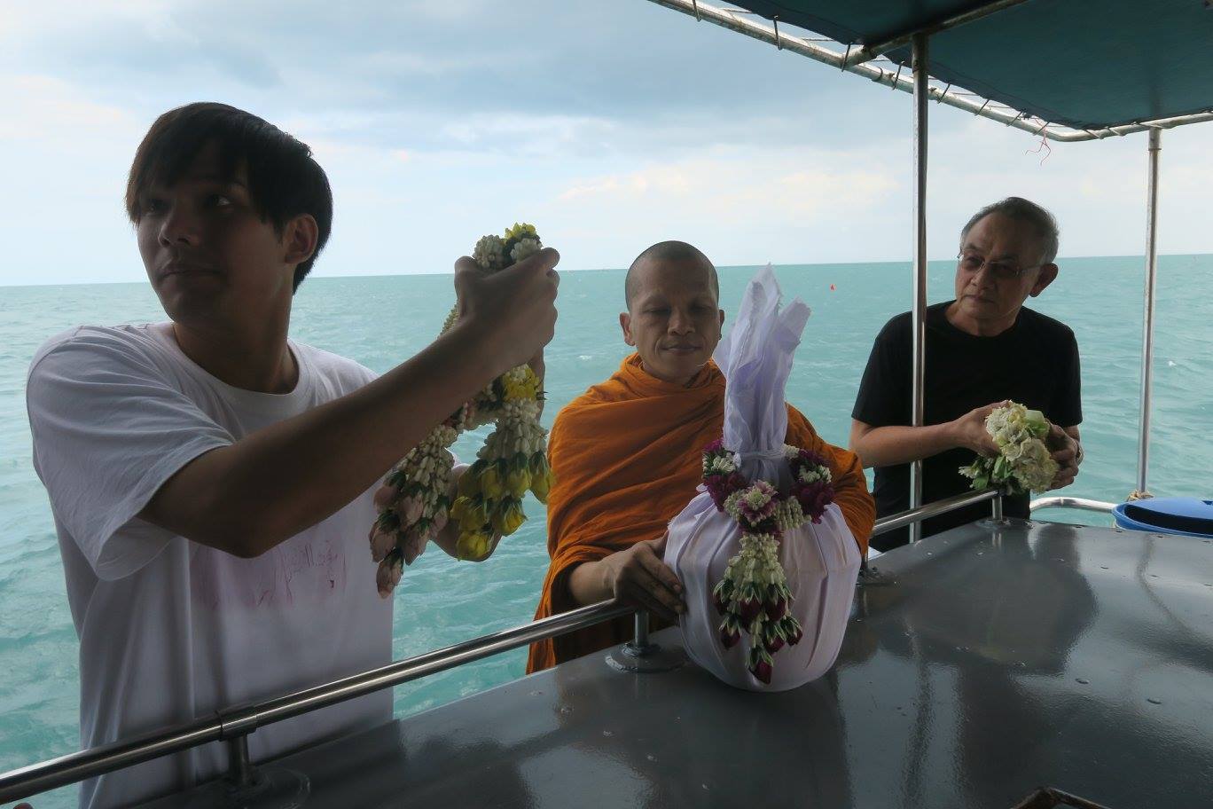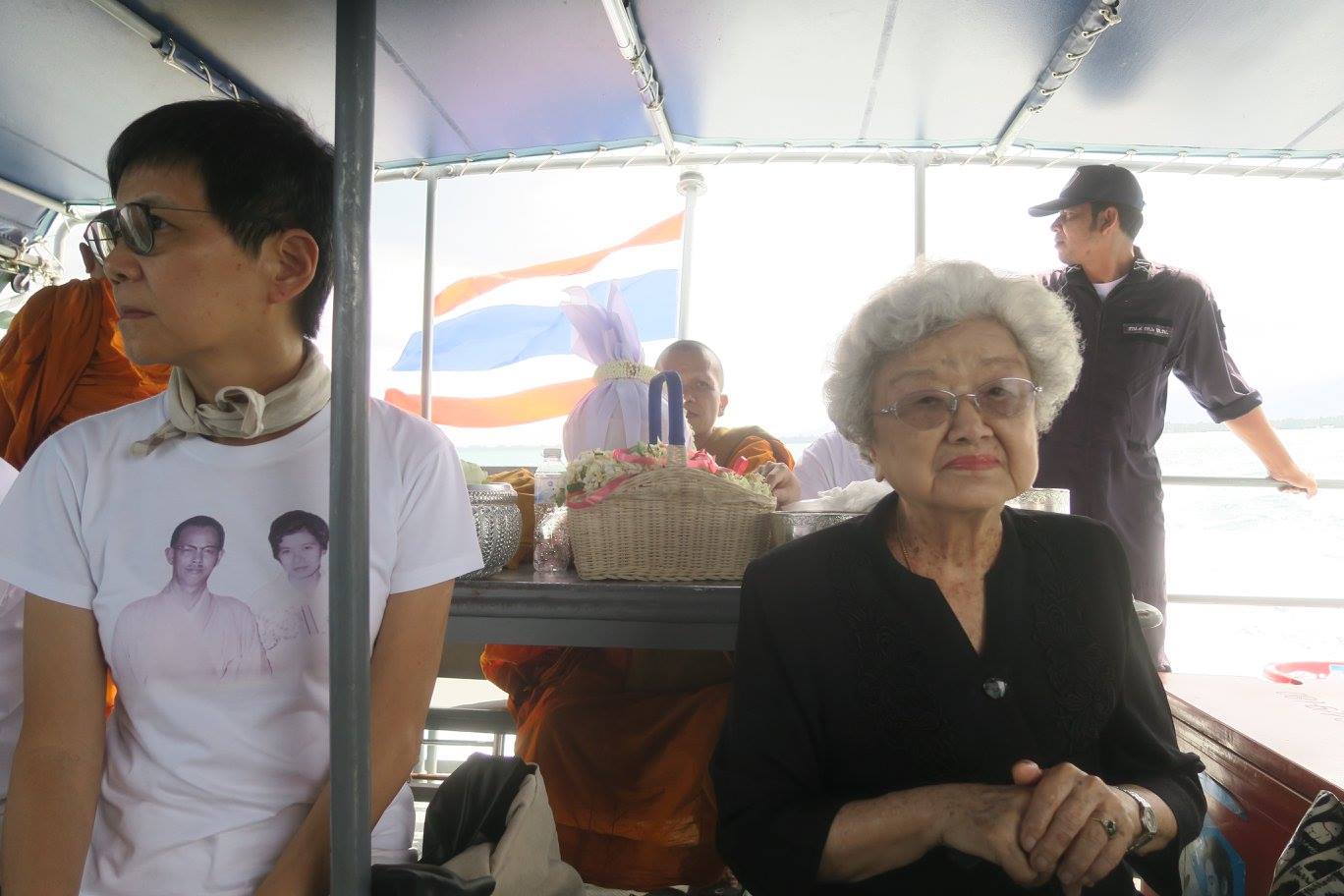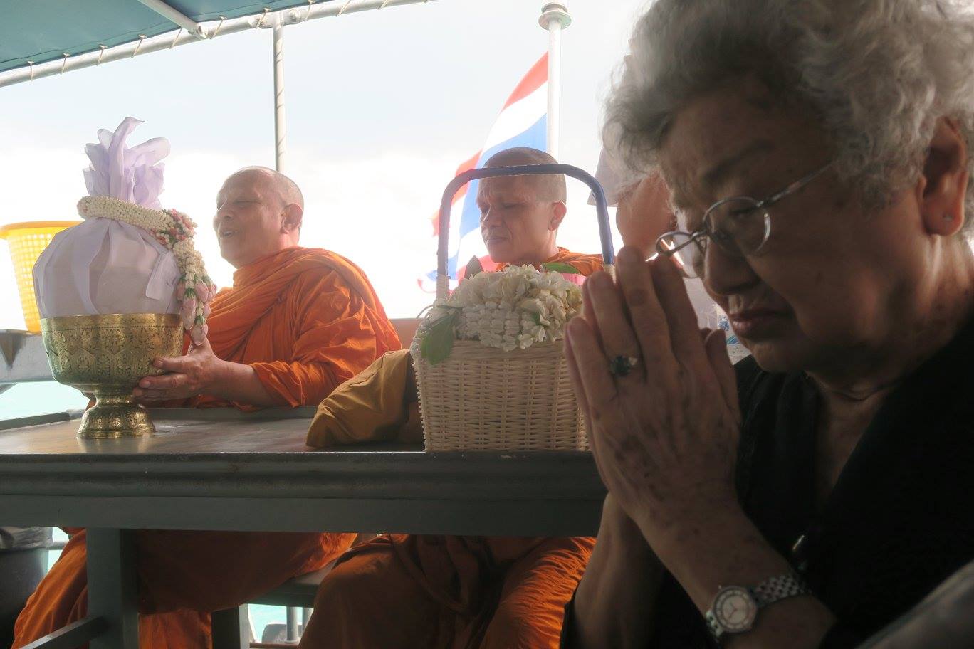 เราไปลงเรือที่ท่าแพปูเลยศาลาน้ำที่เป็นบ้านยายผ่องตาผาดไม่มาก จากนั้นก็ตรงออกปากคลองท่าสูงจนพ้นประภาคารและทุ่นแล้วอ้อมไปถึงหน้าสวนท่าสูงที่แม่กับพ่อ คุณตา น้าพา พาเรามาเล่นน้ำกันเรื่อย ๆ โดยมีท่านเจ้าคุณวัดศรีทวีฯ นำภาวนาตั้งจิตส่งแม่แล้วมอบท่านพระครูเหมเจติยาภิบาล ผู้ได้ชื่อว่าเป็นผู็อภิบาลพระธาตุยอดทองของเมืองนคร เป็นผู้วางโถเถ้าอังคารของแม่ลงสู่พื้นทะเล โดยมีพี่โต พี่ตั้ว กับ นายตุ๋มทำหน้าที่แทนพวกเราทุกคนครับ จากนั้นนานาดอกไม้ที่พวกเราทุกคนแบ่งปันกันไว้ก็โปรยปรายตามแม่ลงสู่พื้นน้ำให้ได้หมายตาว่าแม่คืนสู่ธรรมชาติสิ้นเชิงแล้ว ณ บริเวณนั้น ขณะที่เรือก็วนรอบเพื่อทำปัจฉิมสักการะแก่แม่ ภายใต้ธงไตรรงค์ที่โบกสะพัด เป็นยอดเขาหลวงและมหาชัยบนฝั่งกลางหมู่เมฆทะมึนจนตรึงใจทุกถ้วนคนบนเรือที่มาส่งแม่