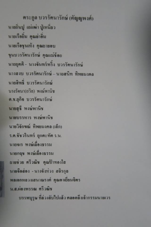 รายชื่อที่แม่กับน้าพาเพียรจดจารและเขียนมาใช้ทุก ๆ คราว และติ่งกับพี่โตได้ปรับปรุงเป็นป้ายพิมพ์มีภาพประกอบให้แม่ดูและใช้มาไม่กี่ปีนั้น ตอนนี้ก็มีชื่อแม่ในทั้งสองแผ่น คือสายบวรรัตนารักษ์และพงษ์พานิช เพื่อพวกเราจะได้สายทำกันต่อตอลดไปนะครับ