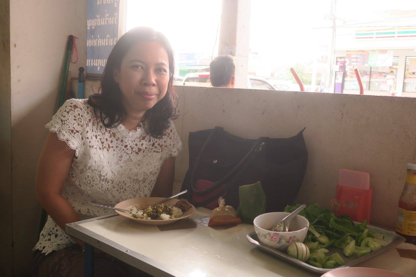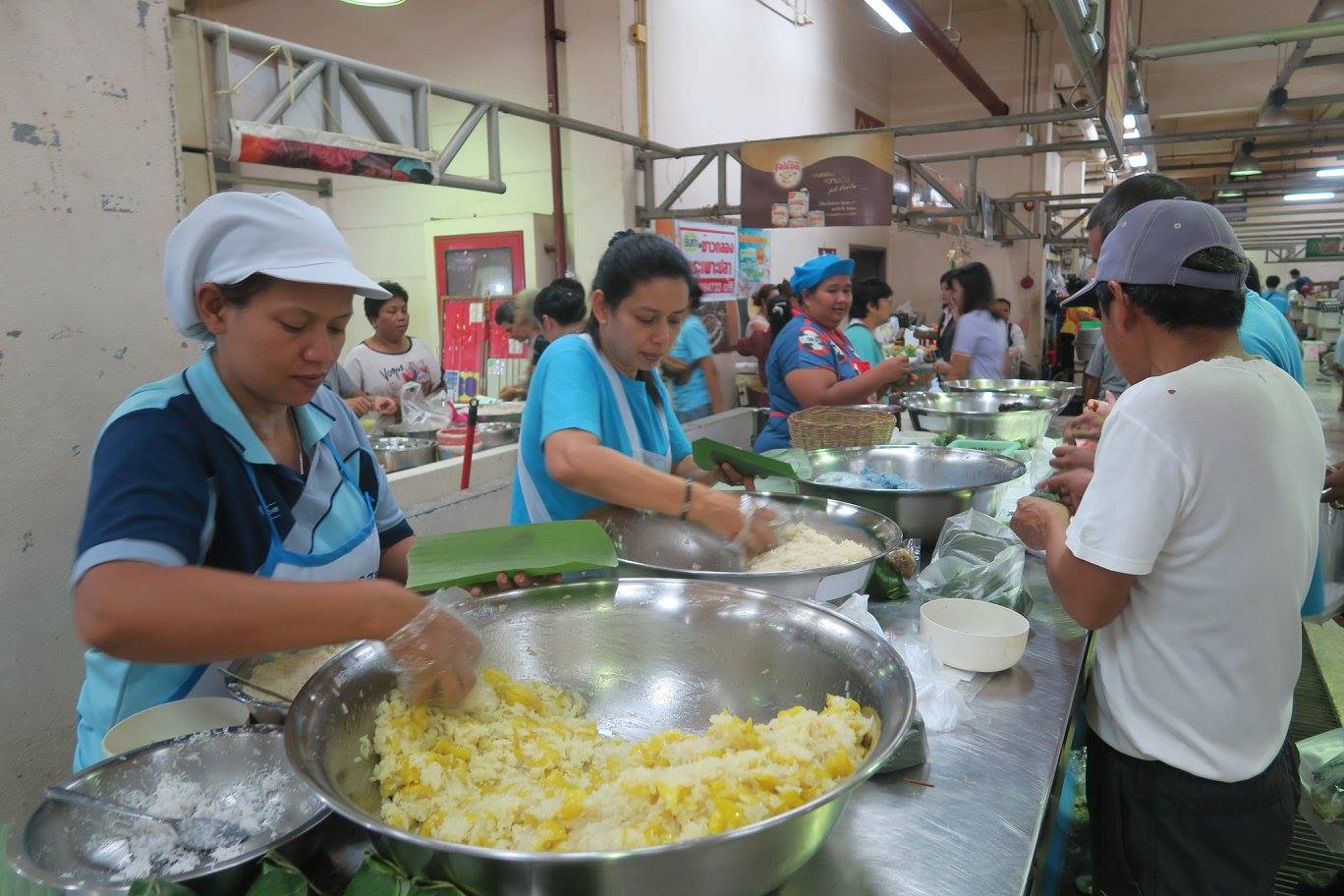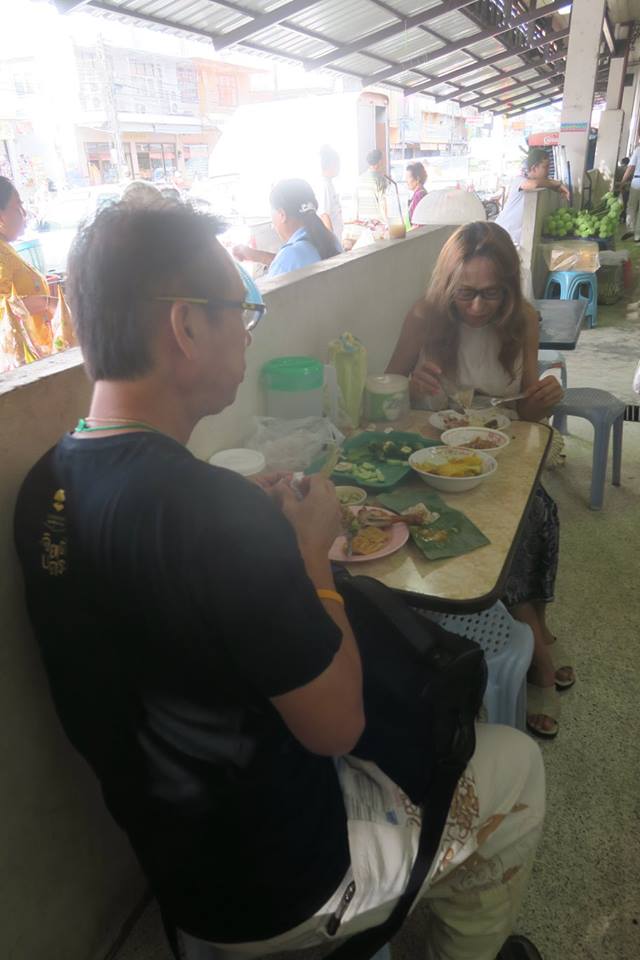 ถึงที่ตลาดก็ทำง่าย ๆ ให้ทุกคนเดินตามเพียง ๕ นาที มีไมโครโฟนตัวนึงชี้ประกาศว่าตรงนั้นนั่นนี่โน่น ลูกเนียงต้ม ข้าวเหนียวกลอย เหนียวเหลือง เหนี่ยงปิ้ง ไก่กอและ ข้ามมันดอกอ้อหน้าแกงกุ้ง หนมจีน ข้าวยำ น้ำพริก โรตีมะตะบะ กะขนมหรั่ง แล้วให้เลือกซื้อหามานั่งกินร่วมกันที่ร้านน้ำชากาแฟริมตลาด แล้วเลือกจ่ายตลาดตามอัธยาศัยให้พร้อมล้อหมุนที่หน้าร้นทองบูรพา ๙ ตรงข้ามตลาด เวลา ๐๘.๓๐ ตรง