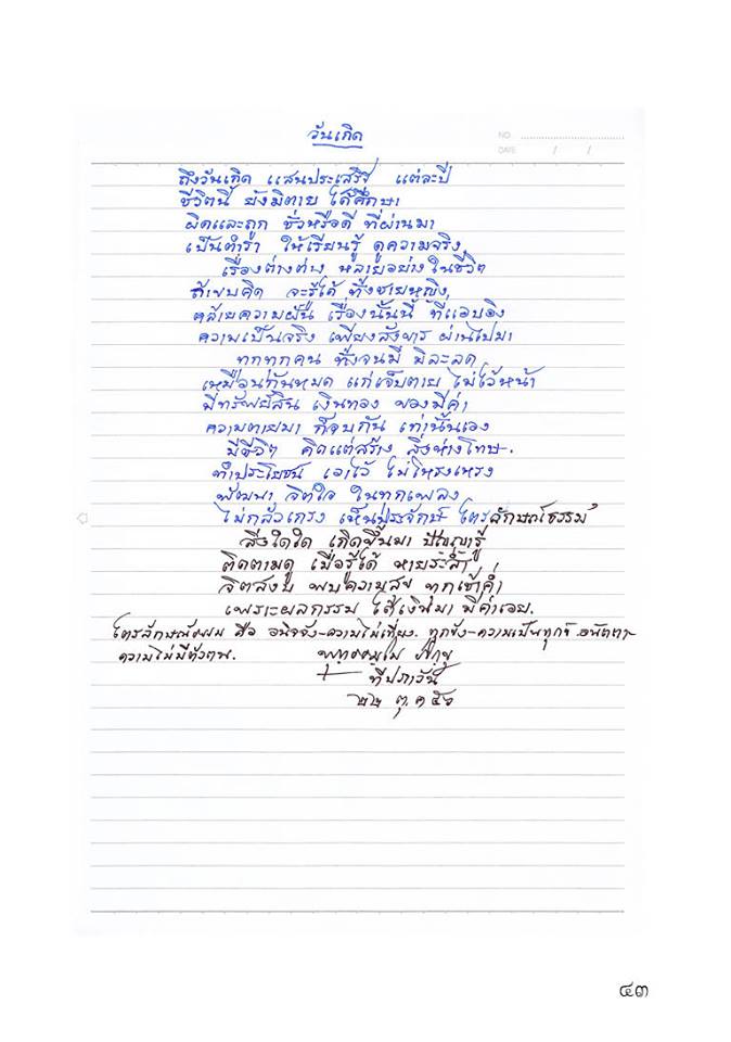 อยู่ทางโน้น แม่ได้เฝ้าพระองค์ท่านหรือยังครับ ทางนี้ ยังไม่รู้ว่าจะได้พาน้าพาไปเฝ้าถวายสักการะพระองค์ท่านเมื่อไหร่ น้าพาบอกว่าไปมาแล้วทุกพระองค์ ตั้งแต่ในหลวงอานันท์, พระนางรำไพฯ, สมเด็จย่าฯ, พระพี่นางฯ ทำนองว่ายังไง ๆ ก็จะต้องไปให้ได้แม้คราวนี้จะไม่ได้ไปพร้อมกับแม่อย่างคราวก่อน ๆ
