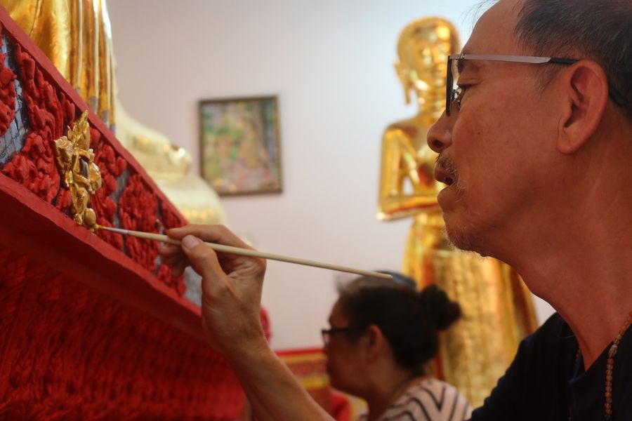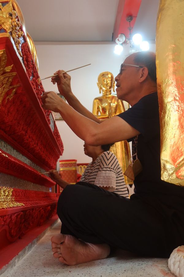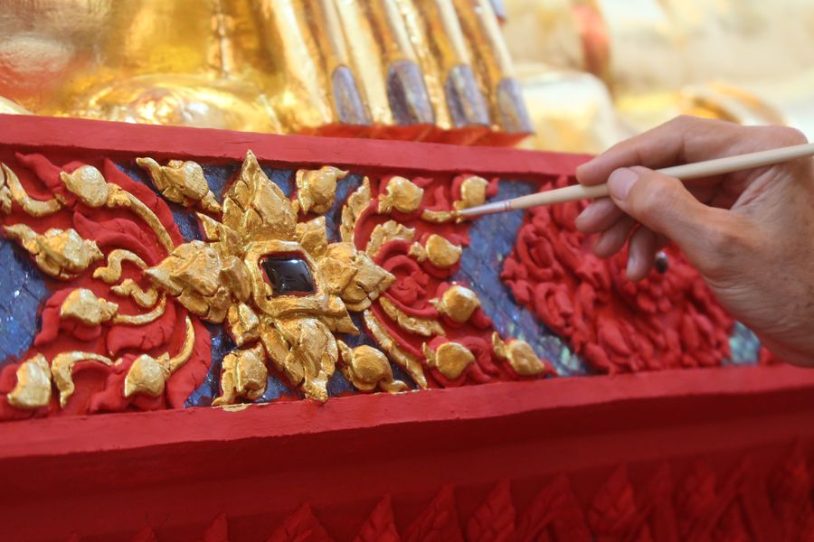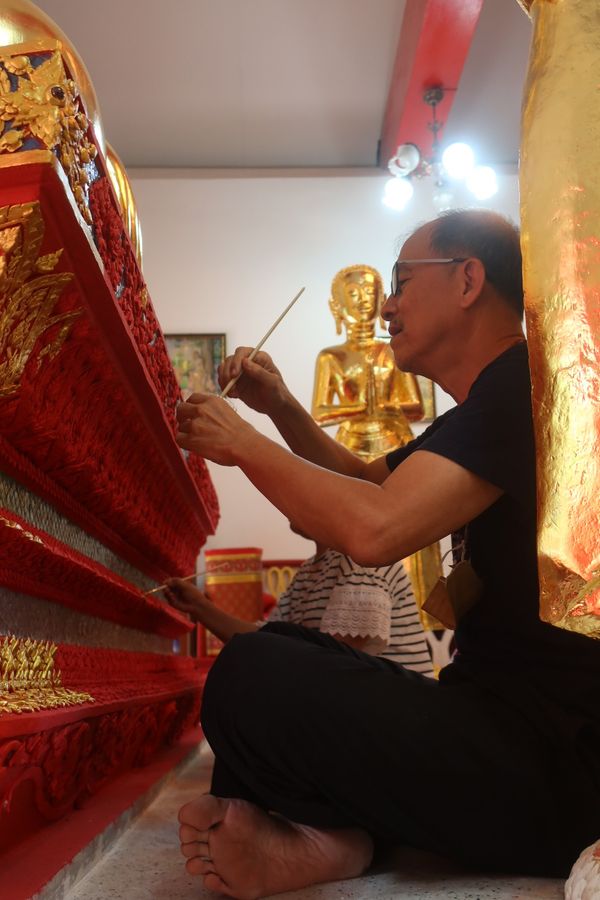 เณร S Guy Guy บอกให้แต้มสีทองลงบนปูนปั้นประจำยามและก้านแย่งตามที่เขาทำไว้