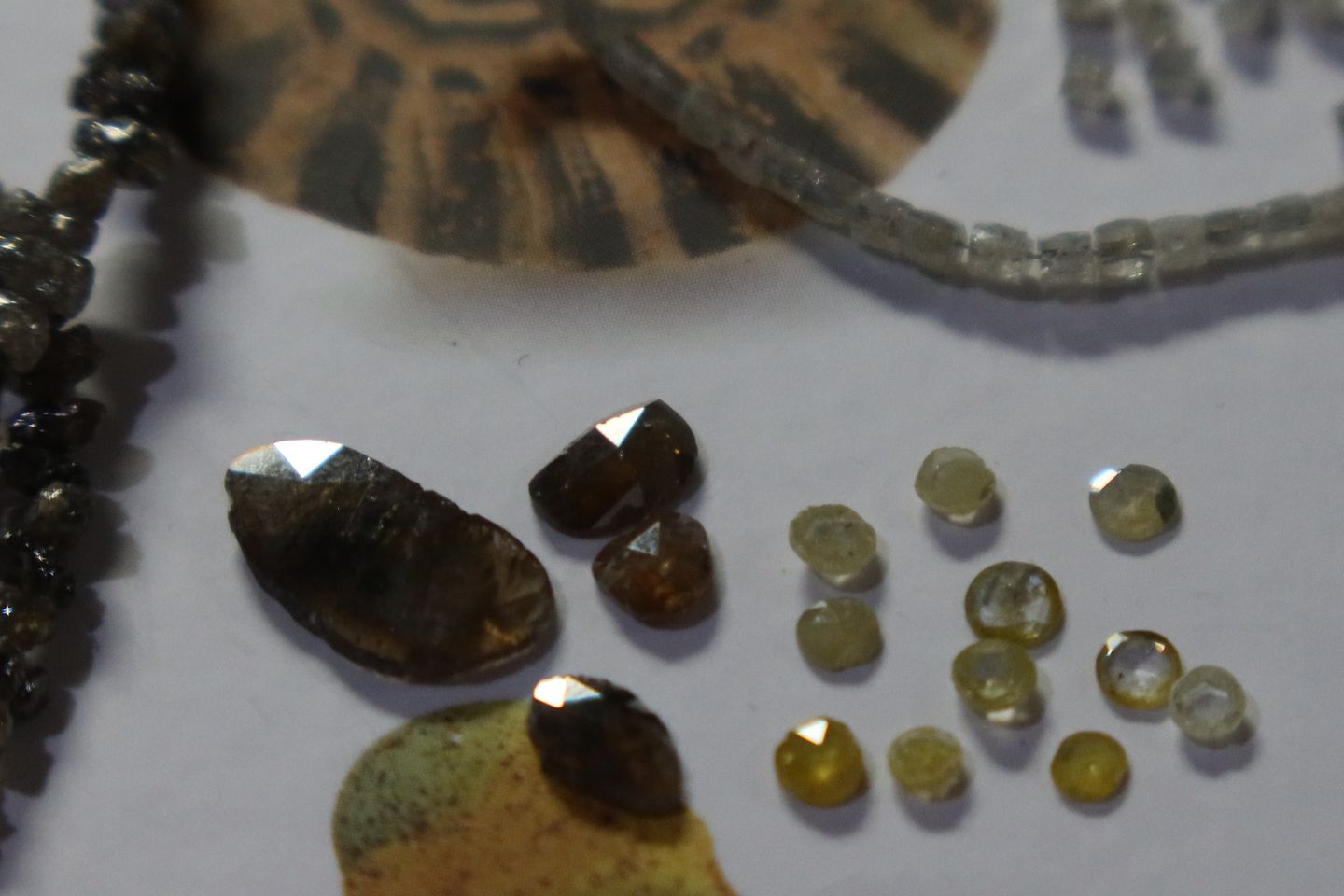 ขณะที่เขาก็ชี้ชวนดูตัวอย่างเพชรต่าง ๆ ที่เขาเอามาตัดมาเจียร์