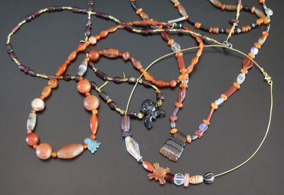 ๒) #ตรีรัตนะโกเมนมีแกะรูปใบหน้าคน บนสายลูกปัดโกเมนสลับทอง พบที่ขเมายี้มะลิวัน