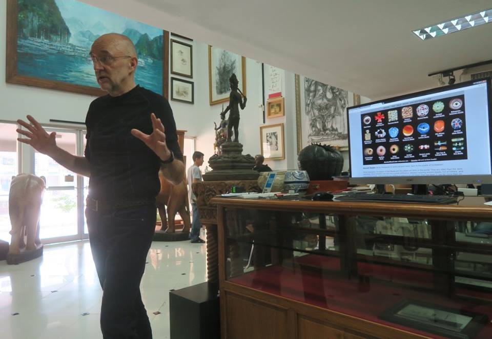 ๑) เขาออกตัวว่า จริง ๆ ไม่ได้สนใจมาก่อน แต่มาฝึกสมาธิที่อินเดีย แล้วมีคนรู้จักสะสมเหรียญแล้วได้ลูกปัดแถมมา ก็เลยให้เขา เขาก็แค่คิดว่าน่าจะขายได้ราคา แต่ค้นไปค้นมา พบว่ามีคุณค่าและความหมายอยู่เบื้องหลังมากมาย โดบเฉพาะสัญญลักษณ์ในพระพุทธศาสนาที่ลึกมาก ๆ