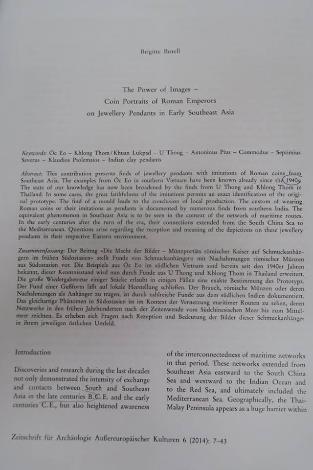 ๑) การพบเหรียญทองคำโรมันครั้งแรกมนอินเดียนั้นพบที่เมือง Nellore ใกล้มัทราสที่ทุกวันนี้เรียกว่าเชนไน เมื่อปี คศ.๑๗๘๗ เป็นเหรียญจักรพรรดิฮาเดรียน พระนางฟอสตินา และ จักรพรรดิแอนโตนินุส ไพอุส จากนั้นก็พบเรื่อยมา ที่มากสุดคือพบทีเดียว ๑,๕๐๐ เหรียญที่ Nalgonda และในการขุดค้นทางโบราณคดีที่นาคารชุนโกณฑะซึ่งพบเหรียญของจักรพรรดิฮาเดรียน ออกัสตัส จักรพรรดิทะเบอรุส และพระนางฟอสตินา แล้วก็มีพบต่อมาเรื่อย ๆ โดยรวมแล้วมีพบเหรียญของ ๒๕ จักรพรรดิ-พระนาง คาบตั้งแต่ ๒๗ ปี ก่อน ค.ศ.จนถึง ค.ศ.๕๑๘ แต่ที่เขารายงานในเล่มนี้ เป็น ๕๙ เหรียญที่พบพร้อมกันในกรุที่ Penuganchiprolu มีรูปและผลการศึกษาว่าเป็นของจักรพรรดิพระองค์ไหนจำนวนเท่าไร แทบทั้งน้ันมีพบทำจี้ที่พบในประเทศไทย รวมทั้งจี้อันใหม่นี้ซึ่ง ดร.บริจิตต์บอกว่าอาจจะเป็นเกรียญแท้ของจักรพรรดิ Domitian ครองราชย์ ค.ศ.๘๑ - ๙๖ แต่ดูรูปแล้วยังไม่ค่อยแน่ใจ