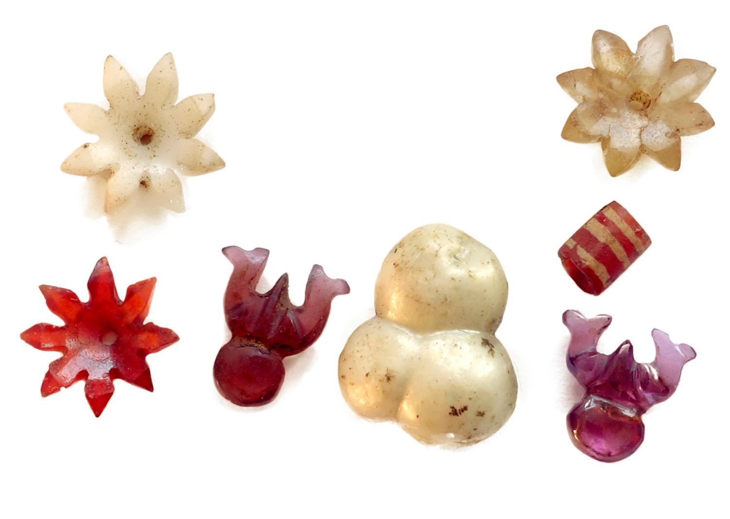 " ... นอกจากลูกปัดรูปดาวดอกไม้และรูปสัตว์แล้ว รูปสัญญลักษณ์ตรีรัตนะที่พบที่ปิปราห์วะ ตามที่สมิธระบุไว้ ๒ ชิ้นนั้น หากดูจากภาพร่างที่มาดามเป๊ปเป้วาดไว้ ยังมีอีก ๓ ชิ้น คือชิ้นที่เป็นแผ่นทองหมายเลข ๓ ที่สมิธระบุว่าเป็นดอกไม้ แต่หากดูให้ดีเป็นรูปตรีรัตนะ ๔ องค์ร่วมหัวกันอยู่ นอกจากนี้ในภาพร่างดังกล่าวยังมีตรีรัตนะอีก ๒ ชิ้น และเมื่อพิจารณาจากภาพถ่ายเก่าในรายงานของเป๊ปเป้ พบว่าอันที่จริงแล้วมีตรีรัตนะที่พบที่ปิปราห์วะมากกว่า ๕ ชิ้น คือในกล่องกลุ่มที่เป็นโลหะ(น่าจะเป็นทอง) มีตรีรัตนะด้วยกัน ๔ ชิ้นใน ๓ กล่อง (รวมทั้งชิ้นที่มี ๔ ตรีรัตนะร่วมหัวกันอยู่ นับเป็น ๑) ขณะที่ในกล่องที่มีหมายเลข 17 มีตรีรัตนะจำนวน ๕ ชิ้น ลักษณะน่าจะเป็นหินชนิดต่าง ๆ รวมเท่าที่มีภาพปรากฏ พบตรีรัตนะที่ปิปราห์วะ ๙ ชิ้น ซึ่งนับว่าไม่น้อยสำหรับการพบในที่เดียวกัน สอดคล้องกับที่ทุกนักวิชาการที่ทำการศึกษาที่ปิปราห์วะระบุ แต่เมื่อเปรียบเทียบกับตรีรัตนะที่พบที่เขาสามแก้วและในพื้นที่ภาคใต้ของไทยแล้ว จะพบว่ามีการพบมากอย่างเหลือเชื่อ คือพบทั้งที่ทำด้วยโลหะโดยเฉพาะทองคำ และหินสีมีค่าตลอดทั้งอัญมณีต่าง ๆ นอกเหนือจากโกเมน มากมายจนยากจะนับได้ เฉพาะที่สุธีรัตนามูลนิธิสามารถรวบรวมไว้ได้ก็มีจำนวนนับ ๑๐๐ ชิ้น โดยพบที่เขาสามแก้วมากด้วยเช่นกัน ยิ่งกว่านั้นยังพบตรีรัตนะที่แกะเป็น ๔ ตรีรัตนะร่วมหัวกันอยู่ด้วย รวมทั้งยังพบที่เหมือนยังแกะเสร็จไม่เรียบร้อยและแตกหัก นำมาซึ่งข้อพิจารณาถึงความเป็นไปได้ว่าจะมีการผลิตสร้างทำที่บริเวณนี้ สอดคล้องกับข้อสันนิษฐานของแฮรี่ ฟอล์ค ... "