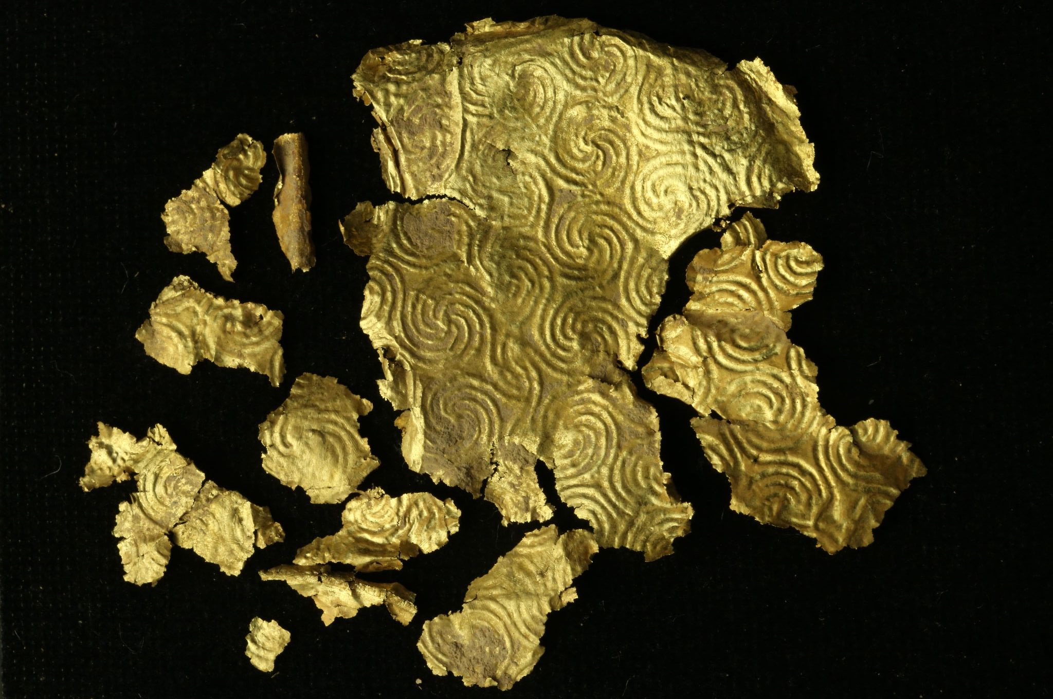 ๒) แผ่นทองดุนลายคล้ายคลื่นไขว้กัน บางท่านว่าเป็นตัวเอสซ้อน