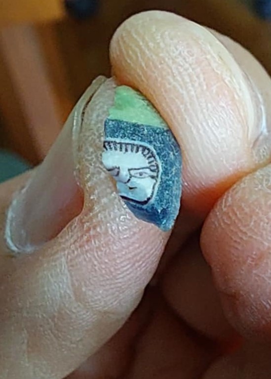 ยังเจอเศษแก้วแตกซึ่งเป็นชิ้นส่วนของลูกปัดโมเสกรูปหน้าคนแบบนี้ด้วย