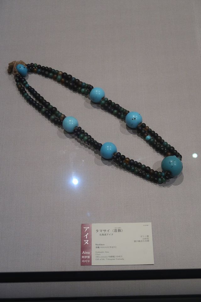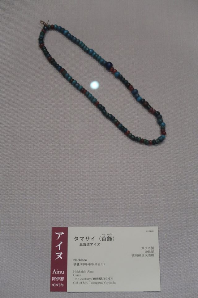 นอกจากลูกปัดโบราณที่เห็นจากสมัย โจมอ ยาโยอิ และ โกะฟุนช ที่พิพิธภัณฑสถานแห่งชาติญี่ปุ่น ในกรุงโตเกียวแล้วที่อาคารหลัก ว่าด้วย Highlights Of Japanese Art มีห้องน้อยหนึ่ง แสดงมรดกตกทอดของคนชายขอบญี่ปุ่นประมาณชาวเขาเมืองไทย คือชาวไอนุ และ ริวกิวที่มีแสดงลูกปัดด้วยแม้จะล้วนเป็นของสมัยหลังมากแล้วแต่ก็มีความหมายมากถึงการใช้สร้อยร้อยลูกปัดกันมาถึงเมื่อเร็ว ๆ นี้เองครับ เชื่อว่า เกี่ยวสัมพันธ์กับทางย่านบ้านเราด้วย