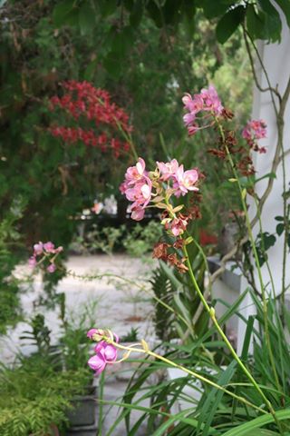 ดอกกล้วยไม้ดินกับหวายแดงกำลังบานสวยอยู่ใต้ซุ้มพวงโกเมน