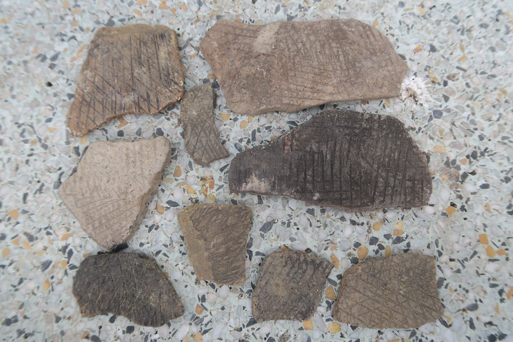 ภาพเจ็ด เป็นกระเบื้องดินเผา ลายกดแบบต่าง ๆ ซึ่งหากดูโดยละเอียดน่าจะพบว่าพ้องกันที่พบที่ไหนและสมัยไหน รวมทั้งทำที่ไหน ชิ้นบนสุดซ้ายมือ เป็นลายดอกไม้ คล้ายมากกับที่นิยมทำในอินเดียโบราณ ในทั้งหมดนี้ที่เป็นเนื้อละเอียดอย่างอินเดียหรือรูเล็ตต์แวร์ พบเพียงชิ้นเดียวเท่านั้น แต่ไม่มีลานลูกกลิ้ง