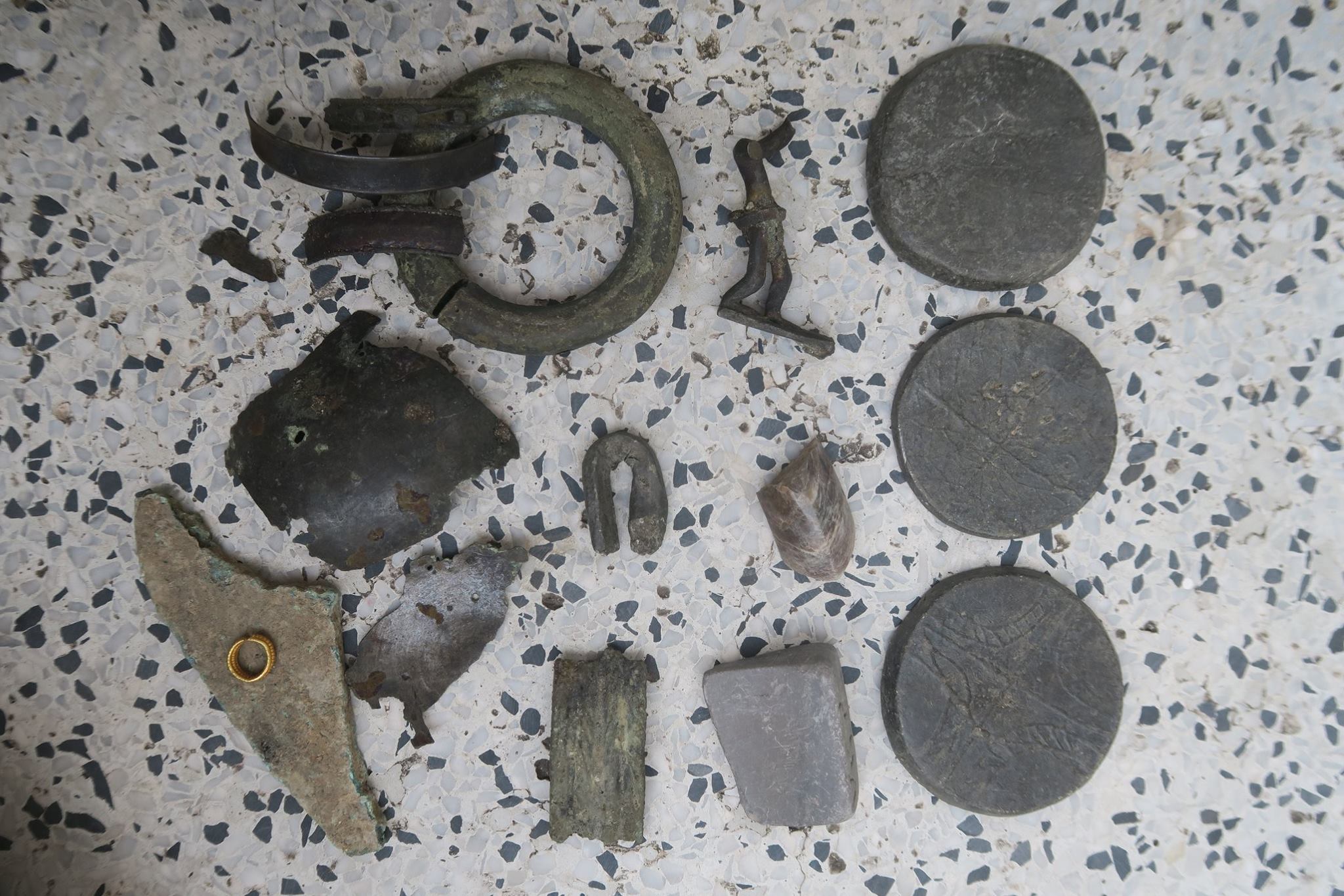 ภาพสิบเอ็ด-สิบสาม เจอกลุ่มโลหะหลงอยู่ถุงหนึ่ง มีทั้งกำไลหลายรูปแบบ กับเศษภาชนะ ชิ้นส่วนแผ่นสำริด แต่ที่พิเศษคือ มีตุ๊กตาตัวหนึ่งเหลือแต่ตัว แล้วก็แผ่นโลหะกลม ๓ อัน มีลายบนหลังแตกต่างกัน แล้วก็ต่างหูทองอีกอันหนึ่ง ดีที่เมฆกับหมอกไม่เอาไปเล่นเสียไกล