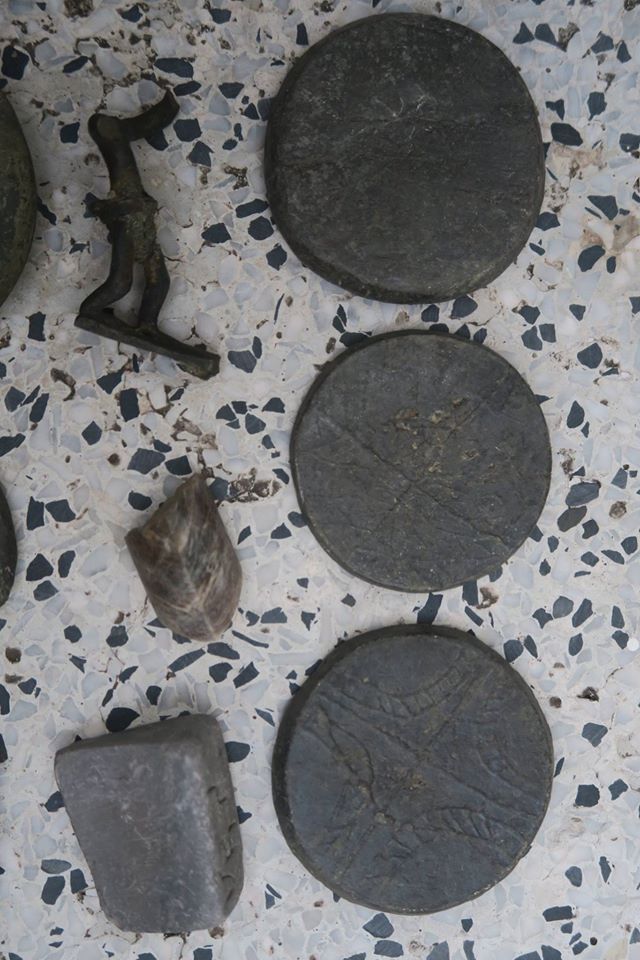 ภาพสิบ เป็นก้อนหินต่าง ๆ ชิ้นมีรู้ไม่รู้ใช้ทำอะไร มีลูกแวดินลูกหนึ่ง