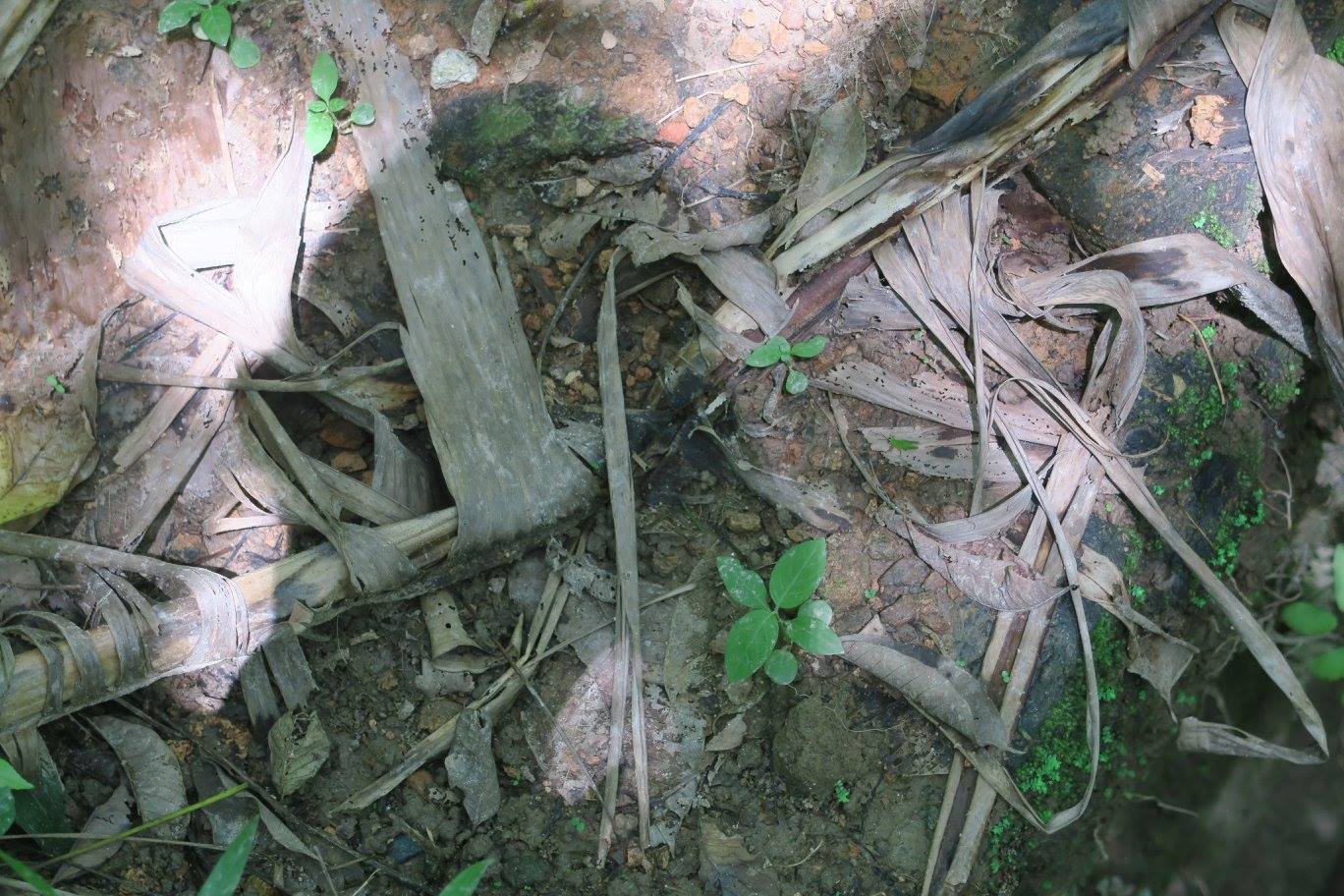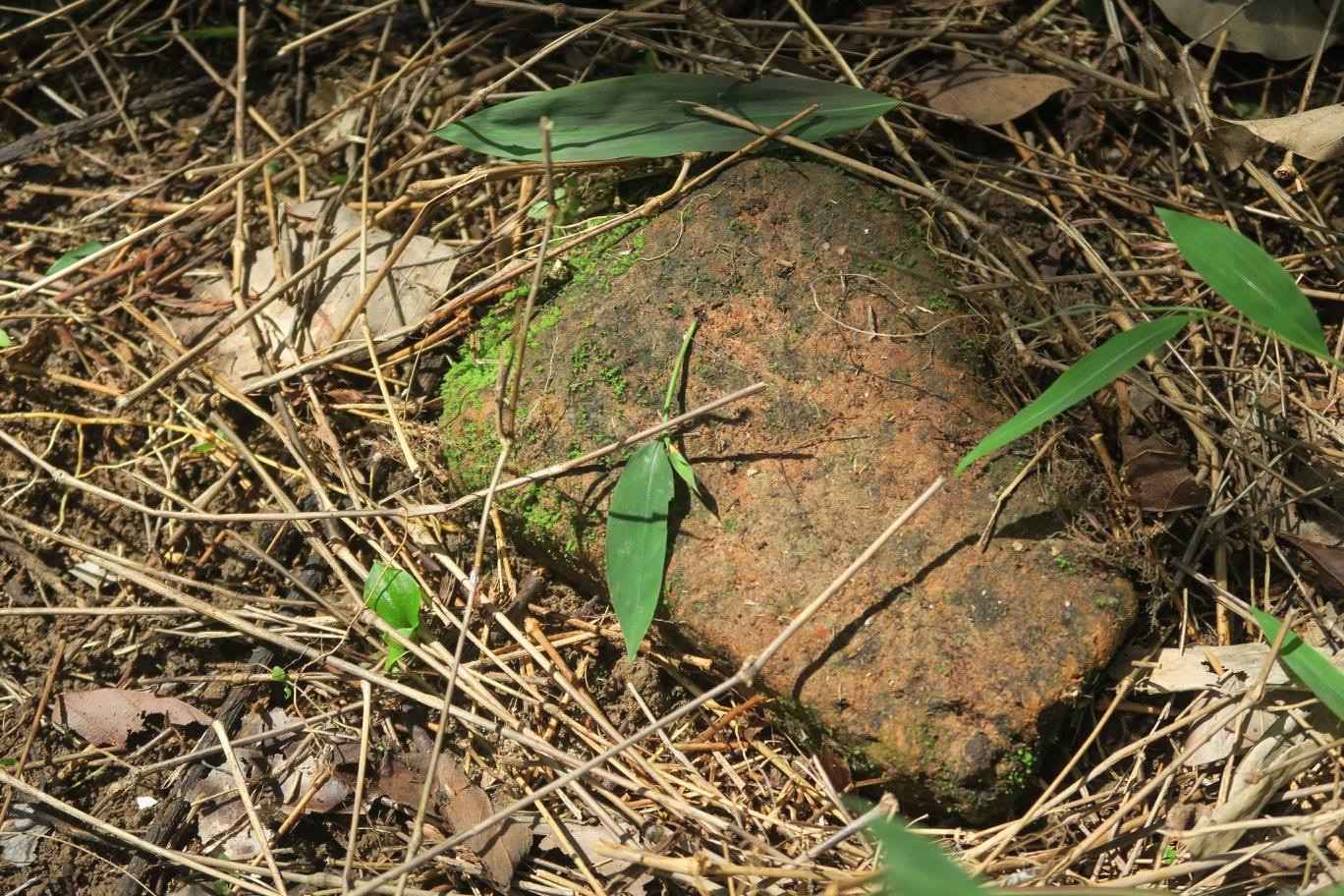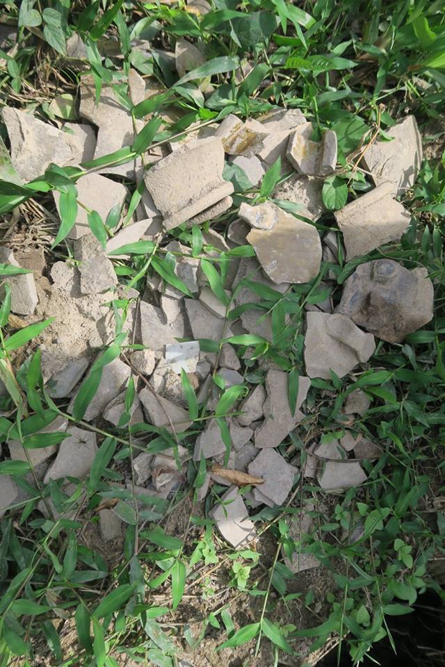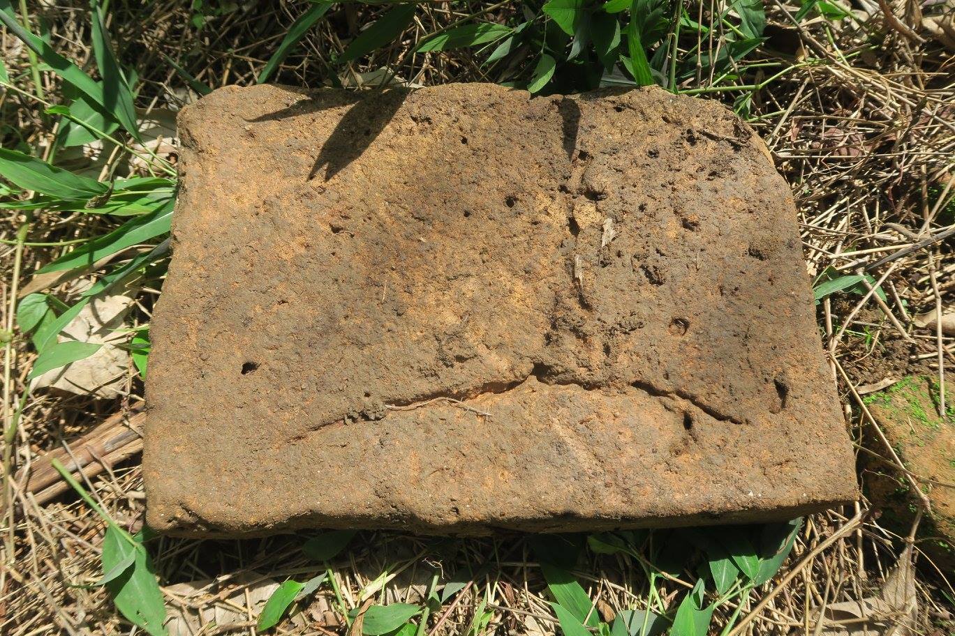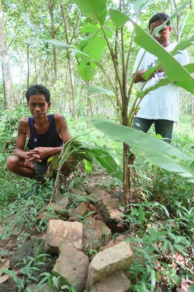๔) ศราวุธ ศรีทิพย์ บอกผมว่า พอดีตอนนี้มาทำงานประจำอยู่ที่บ้านจึงมีเวลา และราคายางก็ตก ญาติที่เป็นเจ้าของสวนจึงไม่ว่าอะไรหากจะสำรวจ เพราะกำลังรอการประกาศขายทั้งแปลง เท่าที่ได้ลองขุดคุ้ยนอกจากร่องและแนวดินกับมีอิฐเป็นบางแนวแล้ว ยังพบเศษกระเบื้องถ้วยมากมายหลายประเภทและยุคสมัย ที่ตำแหน่งหนึ่งน่าจะเป็นกรุอะไร มีก่ออิฐเป็น ๔ ช่อง ในนั้น พบฐานรูปทำด้วยสำริด คนละชิ้นกับรูปที่พ่อเจอเมื่อนานมาแล้ว