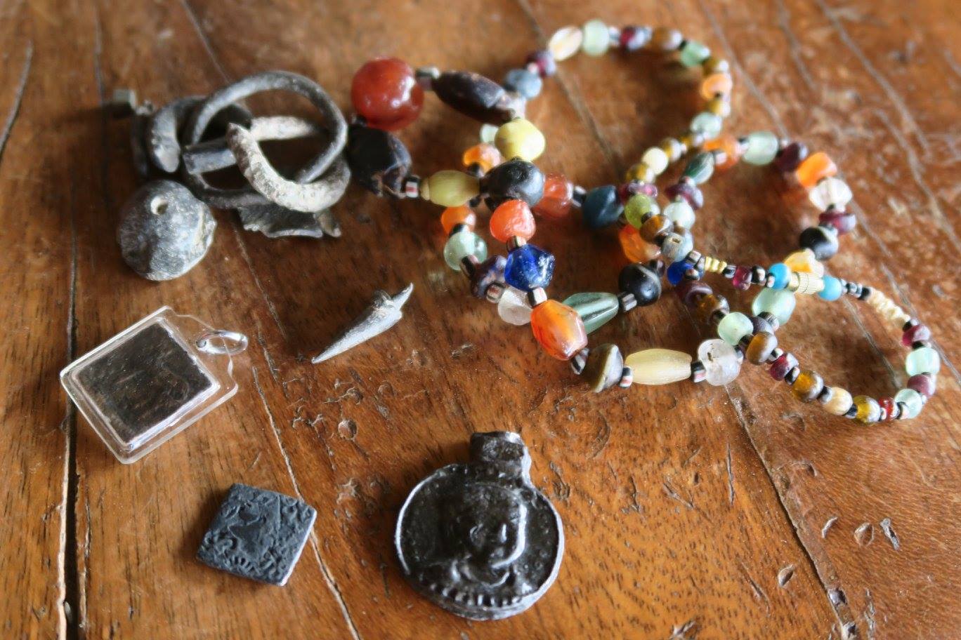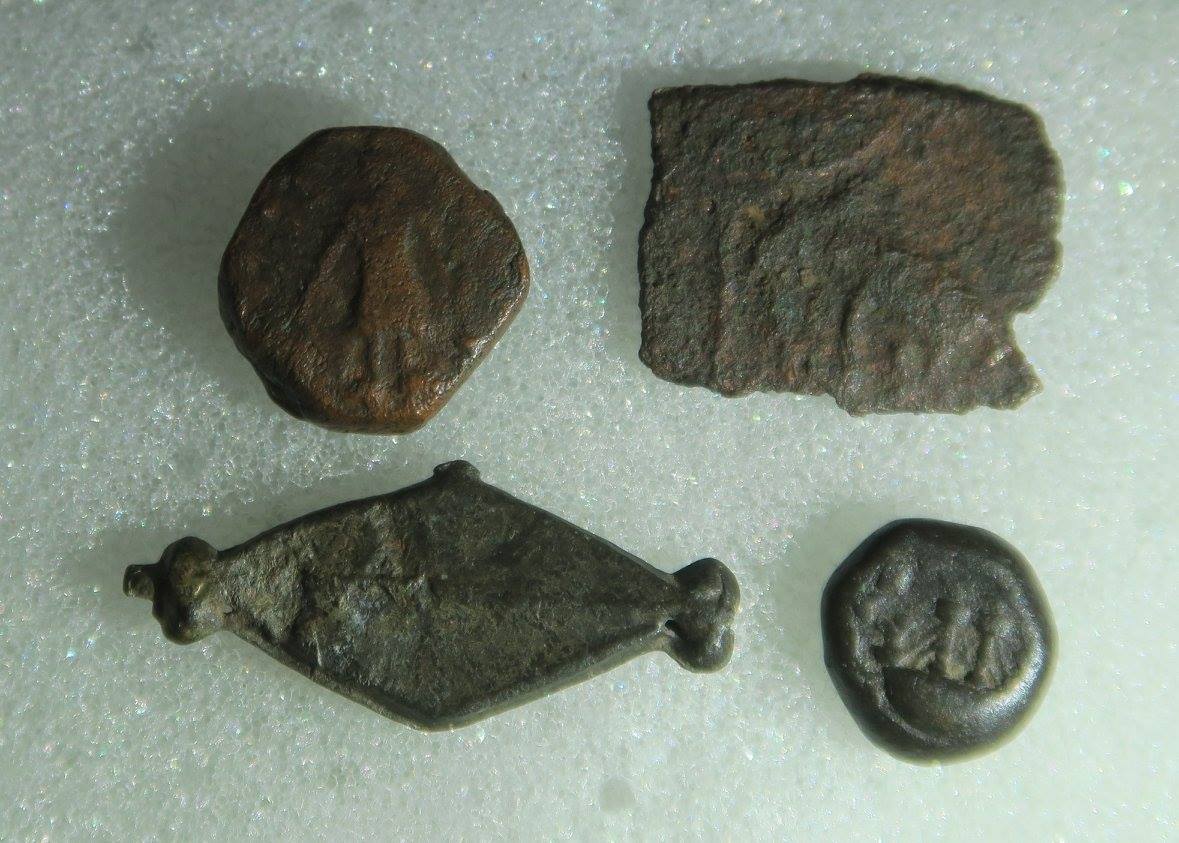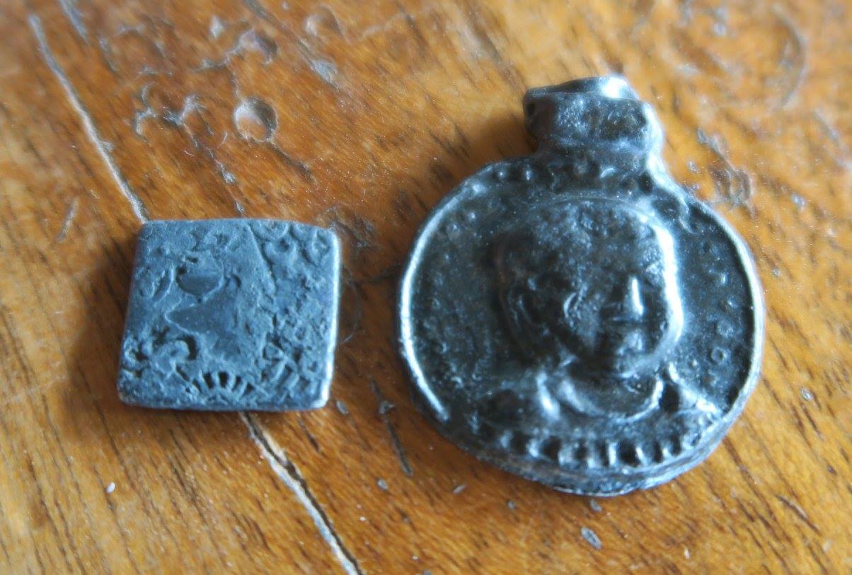 มีทั้งที่เคยเห็นมาก่อนและเพิ่งเอามาให้ได้เห็น เช่นเหรียญมีตรา ๓ อัน ของ อ.วรสิทธิ์ ที่ถือเป็นหลักฐานสำคัญมาก ๆ ทั้งที่มีรูปกษัตริย์กุษาณะใส่เสื้อโค๊ทสวมรองเท้าบู๊ทยืนถือคธา กับเรือน้อยสองเสากระโดงที่มีตราอุชเชนีอยู่ด้านหลัง กับอีกสามจี้ห้อยคอรูปแบบไม่เคยเห็นว่าเป็นใบหน้าใคร ในขณะที่อีกชิ้นสี่เหลี่ยมที่มีตีหลายตรานั้น ตราหนึ่งเหมือนดวงตะวัน อีกตรามีตรีรัตนะอยู่ด้วยนั้น ตำราว่าคือ Punch Mark Coin หรือเงินกหาปณะที่กล่าวถึงตั้งแต่สมัยพุทธกาล-พระเจ้าอโศกโน่น โดยเงินตรานี้มีพบหลายชิ้นแล้ว ในพิพิธภัณฑ์วัดคลองท่อมก็มีจัดแสดงอยู่หนึ่งอัน