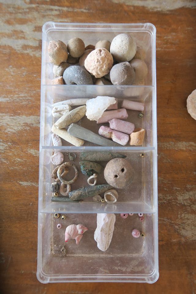 สำหรับสิ่งของที่พบ นอกจากเศษกระเบื้องกับแผ่นอิฐแล้ว ยังพบลูกปัด หิน แก้ว และ ทอง ตลอดจนพระพิมพ์ดินจำนวนไม่น้อย เฉพาะทอง บอกว่าเคยพบเป็นแผ่นรียาว เข้าลักษณะแผ่นทองปิดตามของมนุษย์ก่อนประวัติศาสตร์ ต่างหูทองสองอันที่มีคนถ่ายภาพไว้ก็น่าจะบอกเบาะแสและยุคสมัยได้ด้วย สำหรับลูกปัดที่น่าสนใจมาก ๆ ก็อิฐไส้ดำกับมะยมแก้วสีแปลก ๆ โดยมีใส้เขียวอยู่หนึ่งลูกด้วย ตามที่มีคนถ่ายภาพไว้ การพบเศษก้อนแก้วอาจบ่งบอกว่าที่นี่มีการทำแก้วด้วย