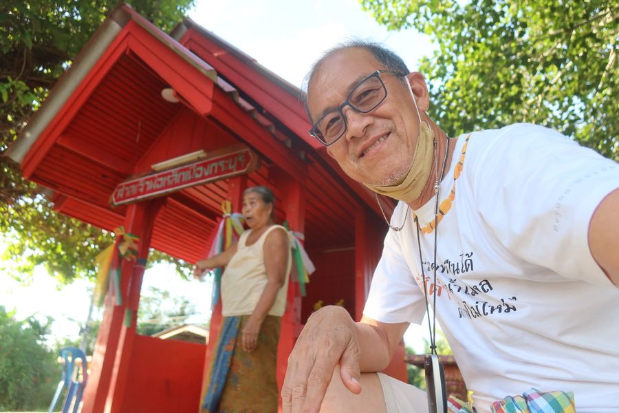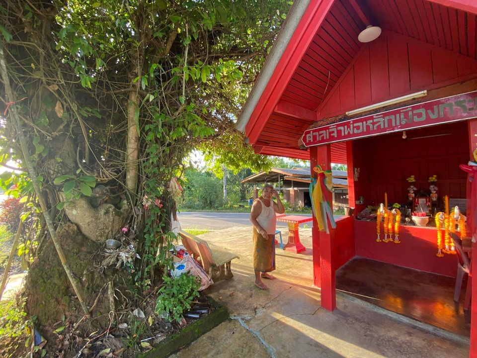 ท่านออกมากวาดบริเวณศาลหลักเมืองพอดี จากนั้นก็พาไปดูกันที่บ้าน
