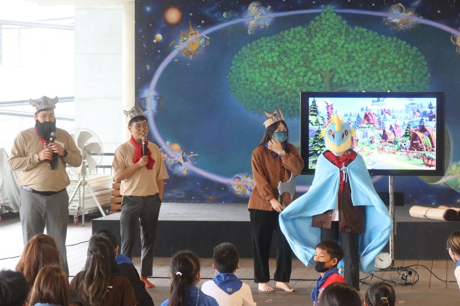 พอเข้าไปข้างใน เห็นเด็ก กำลังเล่นเกมส์เรียนรู้ปราบมังกรกันอยู่