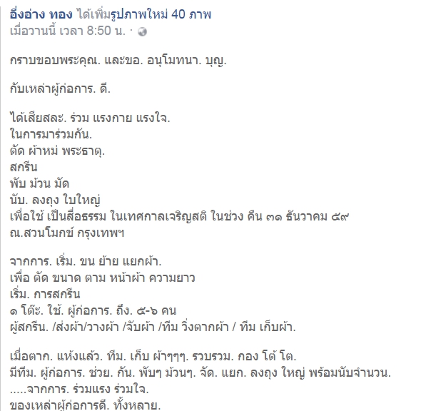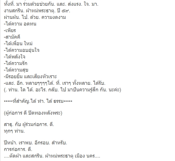 ดีใจที่ได้มีส่วนหลายประการ อาทิ ต้นเรื่องที่หาเรื่องนี้มาให้สวนโมกข์กรุงเทพเมื่อปีที่แล้ว แล้วยังเป็นต้นเรื่องให้งานนี้ไม่เสร็จง่าย ๆ กล่าวคือวันก่อนเขากำลังจะเสร็จที่ ๒,๐๐๐ ผืน ขณะที่สถิติปีที่แล้ว มีคนมากกว่านี้ ประกอบกับไปพบคลังผ้าห่มพระธาตุที่วลัยลักษณ์ขอไปแล้วใช้ไม่หมด ก็เลยต่อสายให้ขอมาเพิ่ม จึงได้มามากกว่าเดิมอีก ข่าวว่าน่าจะครึ่งหมื่นผืนแล้ว วันจันทร์จะมีการทำต่ออีกนิด ๆ โดยเมื่อวันศุกร์ลงไปจะลากลับไปเตรียมงานที่บ้าน แล้วถูมอบหมายให้เป็น "เด็กตากผ้า" ด้วยคน