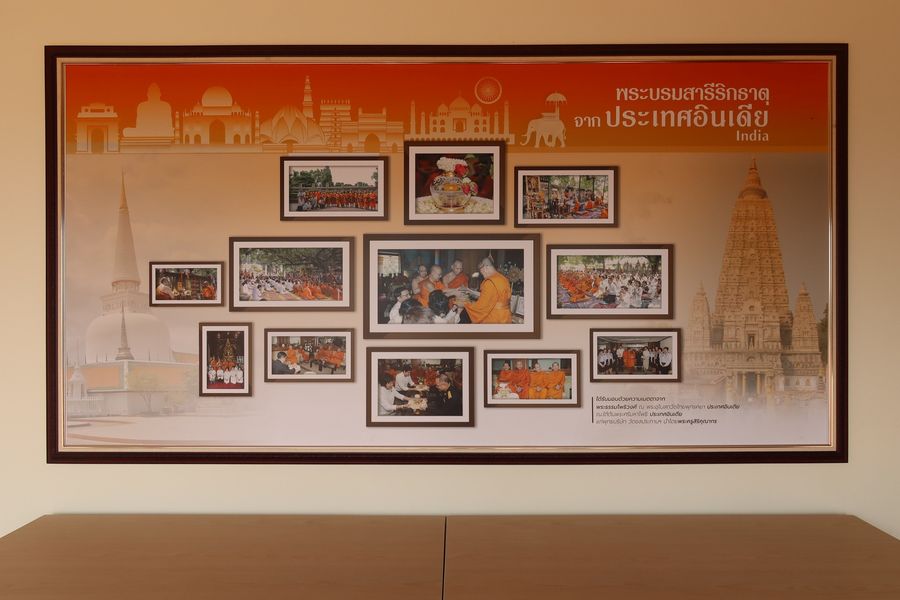ด้านหนึ่ง มีป้ายอธิบายบอกที่มาของพระบรมสารีริกธาตุจาก ๔ แผ่นดิน