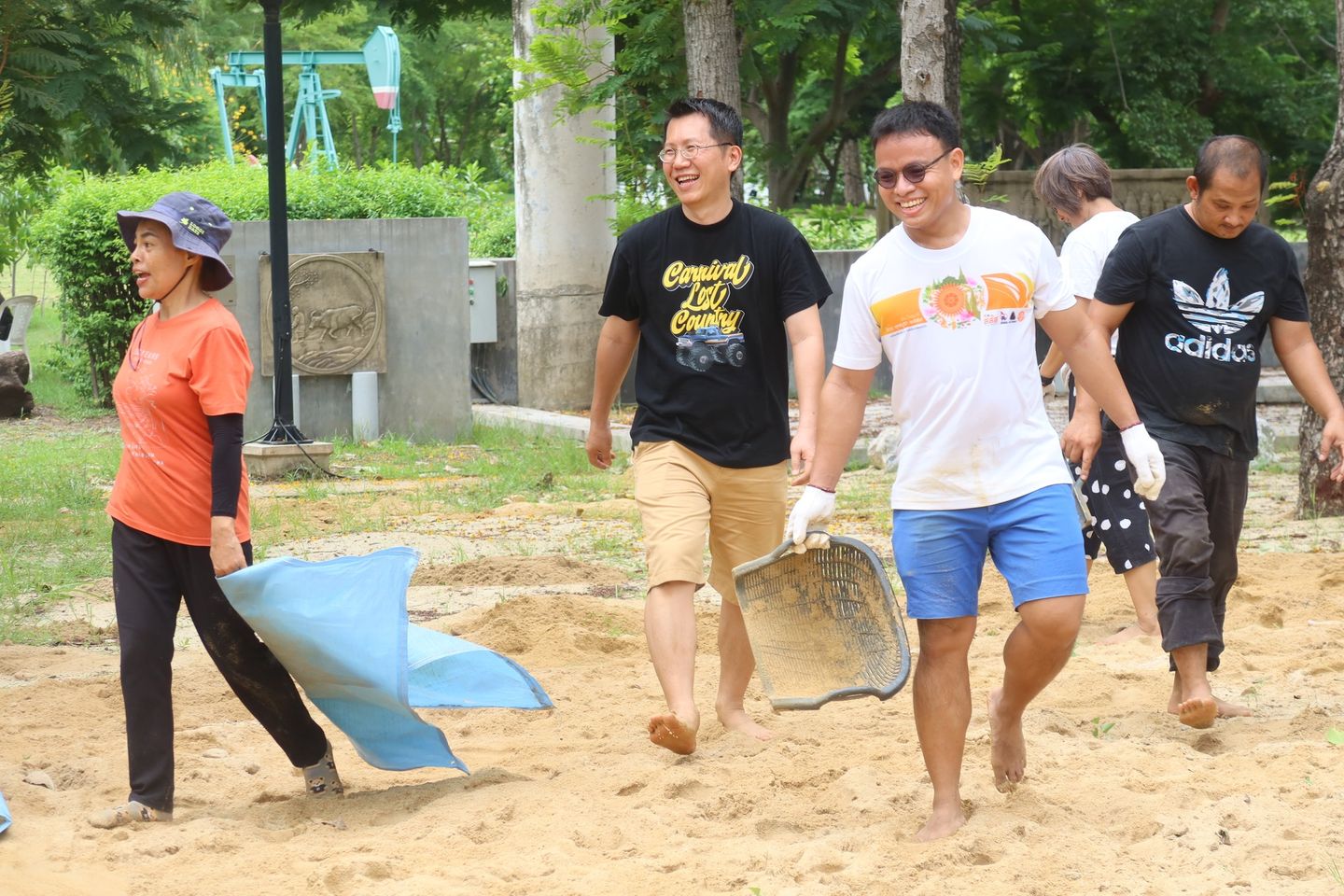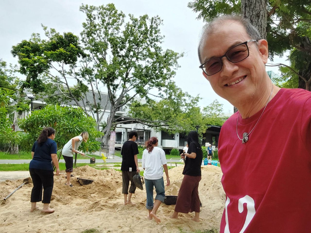 พวกเราก็เลยนัดไปใช้แรงงานขนเกลี่ยทรายที่กองค้างไว้เมื่อวิสาขบูชา