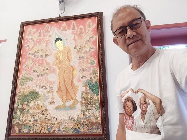 กำลังปฏิสันถารพร้อมอธิบายภาพจิตรกรรม