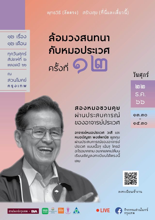 ด้วยวันศุกร์ที่ ๒๒ ธันวาคมนี้ ท่านอาจารย์หมอประเวศ วะสี จะมาบรรยายเชิงเสวนาในหัวข้อ “#พุทธวิธีสร้างสุขกับหมอประเวศ” ที่ หอจดหมายเหตุพุทธทาส อินทปัญโญ - สวนโมกข์กรุงเทพ ระหว่างเวลา ๑๓.๓๐ – ๑๕.๓๐ น. โดยกิจกรรมนี้เกิดจากความร่วมมือกันของหลายองค์กร เตรียมการไว้ตั้งแต่ก่อนเกิดการระบาดของโรคโควิดแล้วชะลอไว้จนได้เริ่มต้นตั้งแต่ต้นปีพุทธศักราช ๒๕๖๖ ในทุกบ่ายวันศุกร์ที่สองของแต่ละเดือน พร้อมการถ่ายทอดสดทางช่องทางต่าง ๆ และสามารถติดตามชมและฟังย้อนหลังได้ โดยครั้งนี้จะเป็นครั้งที่ ๑๒ ส่งท้ายปี และท่านอาจารย์หมอประเวศให้ย้ายมาจัดใกล้ ๆ สิ้นปีเพื่อเป็นการเสริมสร้างความสุขแก่กันและกัน