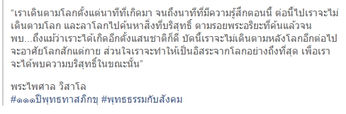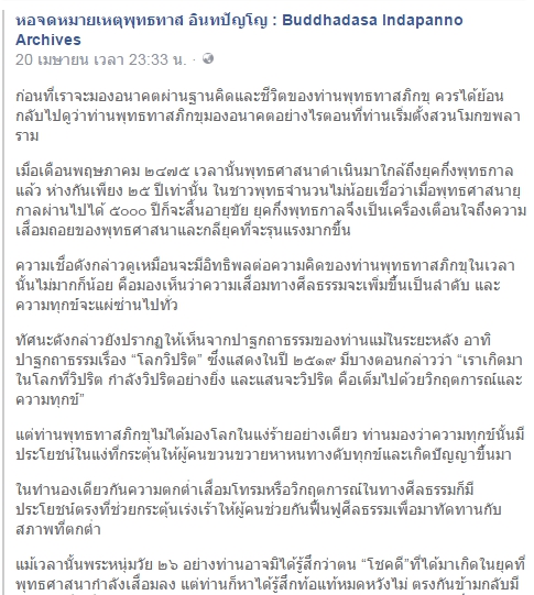 "...ยุคกึ่งพุทธกาลจึงเป็นเครื่องเตือนใจถึงความเสื่อมถอยของพุทธศาสนาและกลียุคที่จะรุนแรงมากขึ้น ... ความเชื่อดังกล่าวดูเหมือนจะมีอิทธิพลต่อความคิดของท่านพุทธทาสภิกขุในเวลานั้นไม่มากก็น้อย คือมองเห็นว่า..."อีกคำครูที่ขอเชิญชวนให้อ่านกันวันนี้