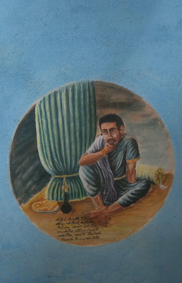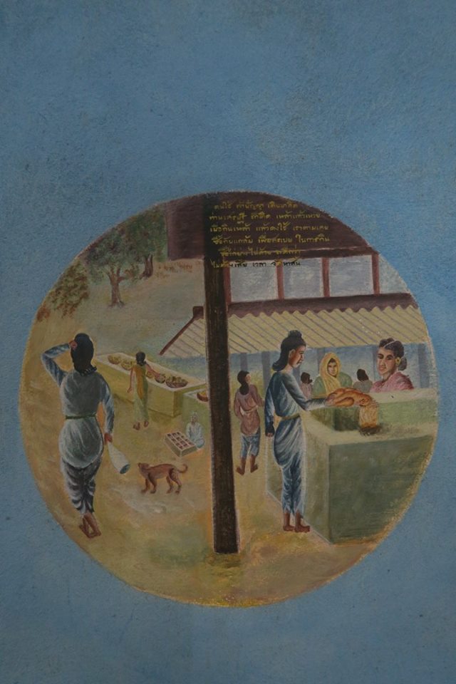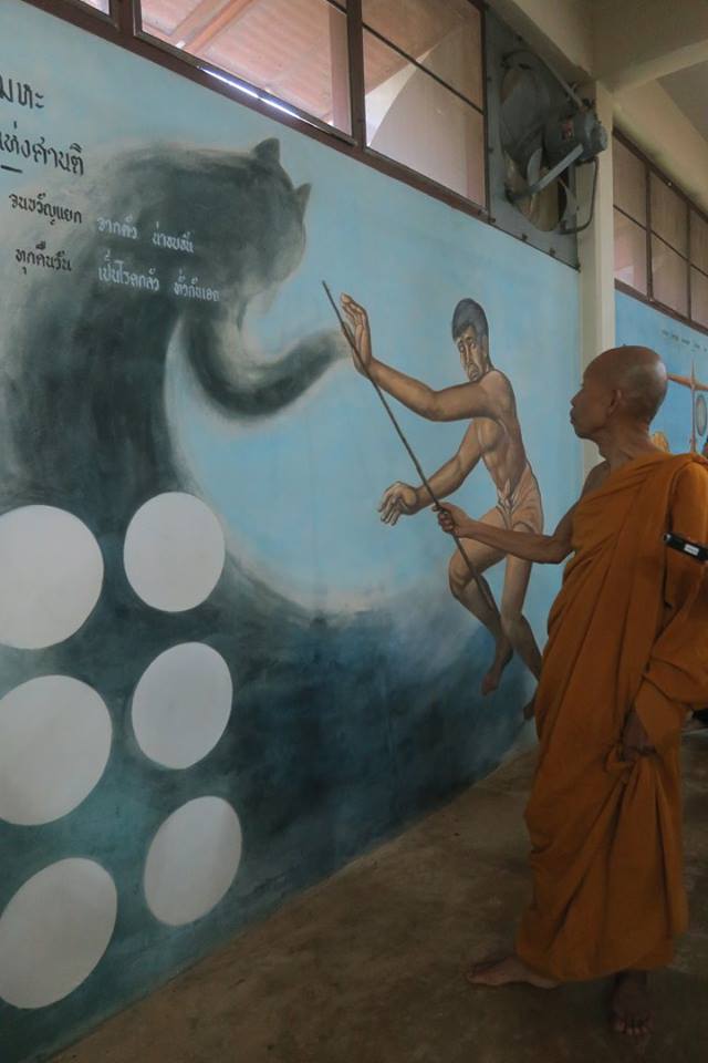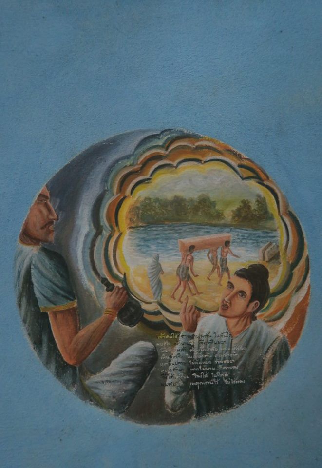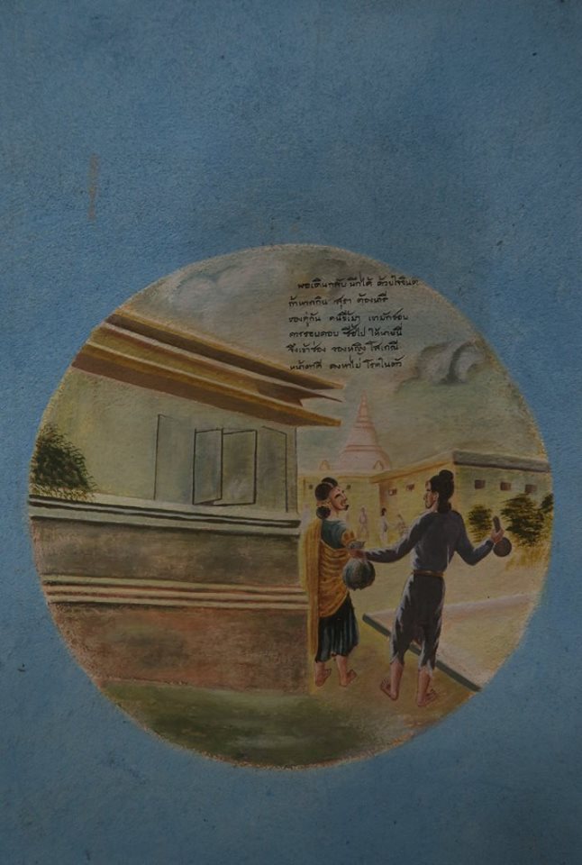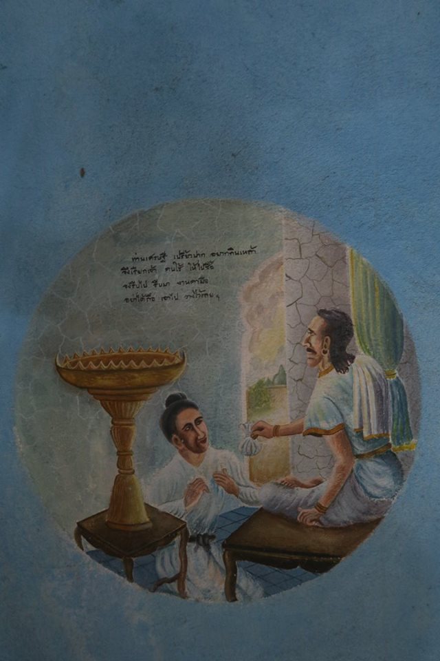 มีอาจารย์วิทย์ พิณเมืองเงิน คนมาวัดแล้วอาสาวาดไว้ โดยตอนนั้นก็วาดเป็นภาพใหญ๋ ๆ เต็มผืนผนังอย่างที่เห็นบนชั้นสองตอนนี้