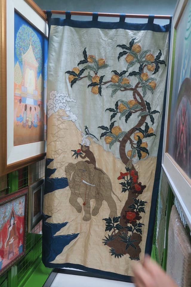 ขณะที่ภาพพระโพธิสัตว์นั้นทำด้วยเทคนิคตัดผ้าเย็บอย่างละเอียดยิบ