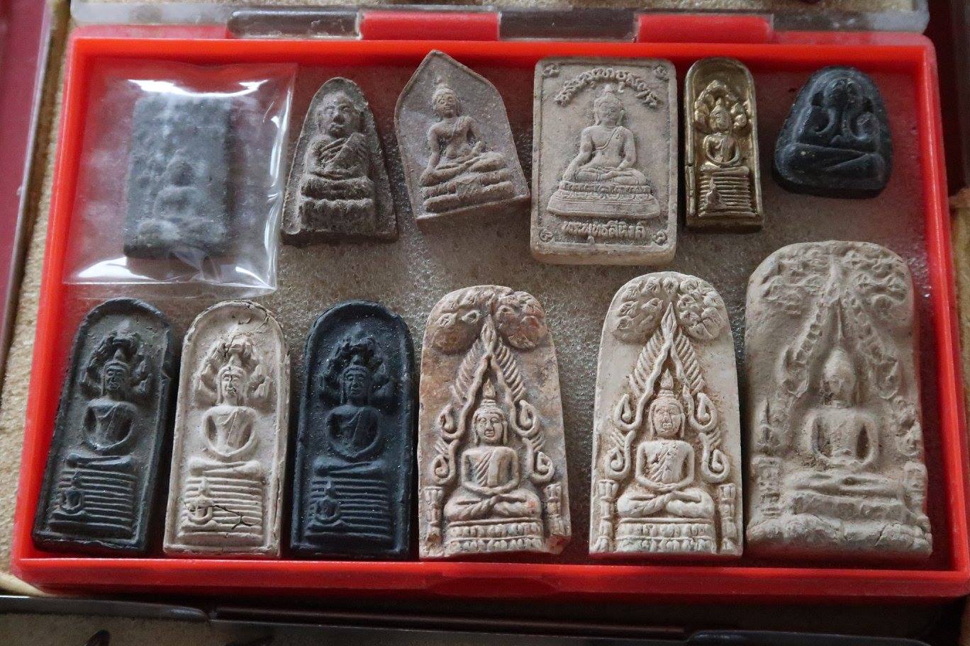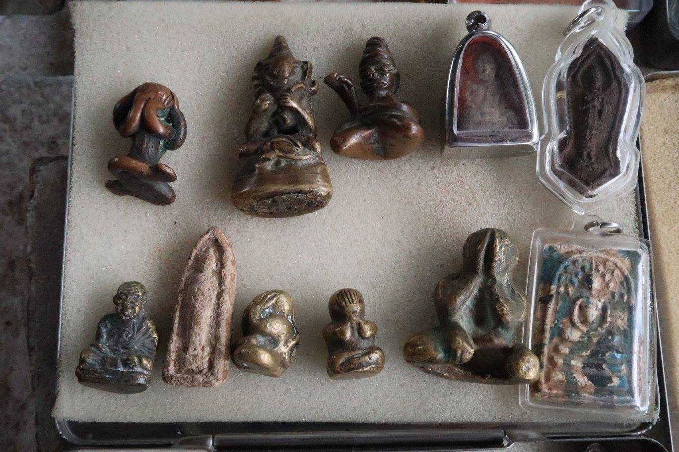 ๑) พระที่อยู่ในข่ายของเก่า เห็นไม่เท่าไหร่ มีพระพิมพ์ดินดิบมหาปาฏิหาริย์องค์หนึ่ง บอกว่ามาจากกำแพงถม ส่วนพระพิมพ์ผาลไถ พระนางตรา พระปรกโพธิ์ท่าเรือ เห็นมีบ้างประปราย หลายพิมพ์หลายยุคหลายสมัย แต่ไม่เห็นที่เป็นองค์สำคัฐ รวมทั้งพระยอดขุนพลกรุนาสน เห็นรูปดินเผาท้าวกุเวรกับคชลักษมีชิ้นหนึ่ง ถามว่ามาจากไหน ตอบว่าจากวัดนครโกษา ลพบุรีโน่น