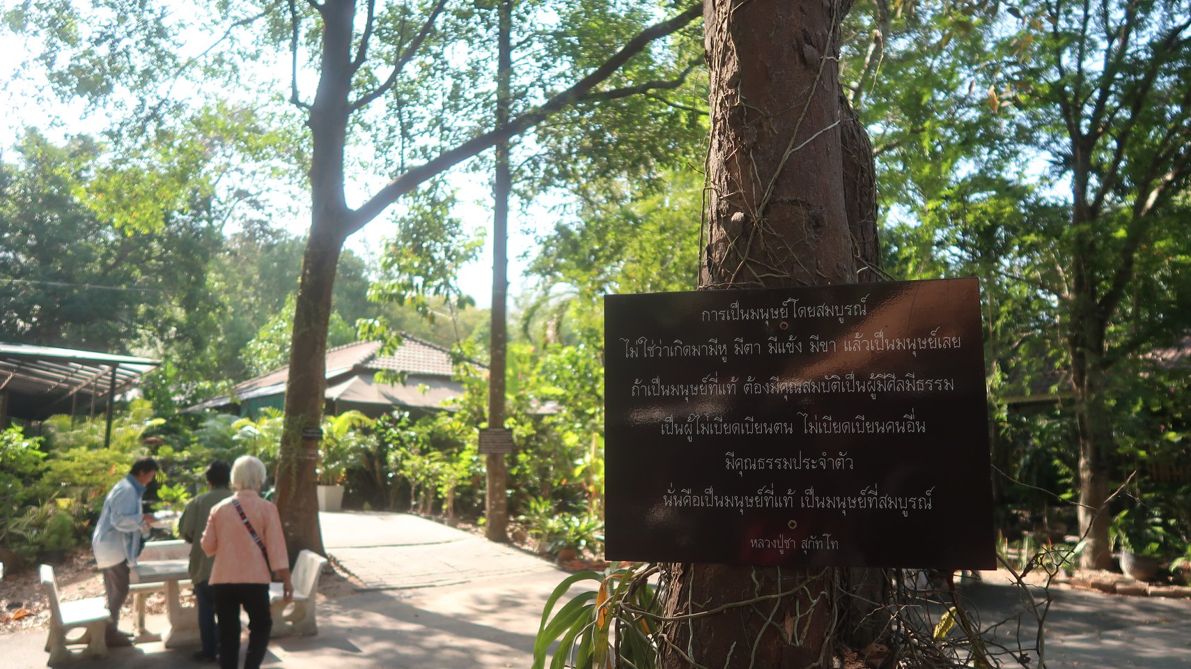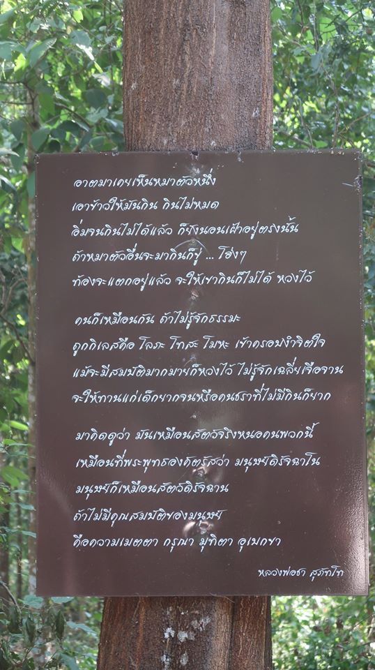กว่าบัวกระด้งที่บานนานจนเฉาแล้วรวมทั้งเจ้าหมาหนุ่ม ที่กำลังจิบน้ำจากอ่างบัวอย่างหวาด ๆพวกเราไม่มีเวลากินข้าวก้นบาตรที่โรงทานแต่ก็มีการพกพากันไปกินกันบนรถผมเจอป้ายท้าย ก่อนขึ้นรถเรื่องการเป็นมนุษย์โดยสมบูรณ์นี้ ...นี่คือเป็นมนุษย์ที่แท้ เป็นมนุษย์ที่สมบูรณ์ของท่าน อ.ชา ครับ