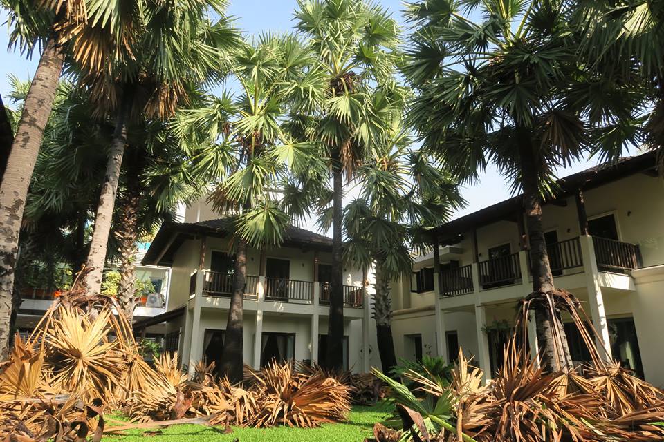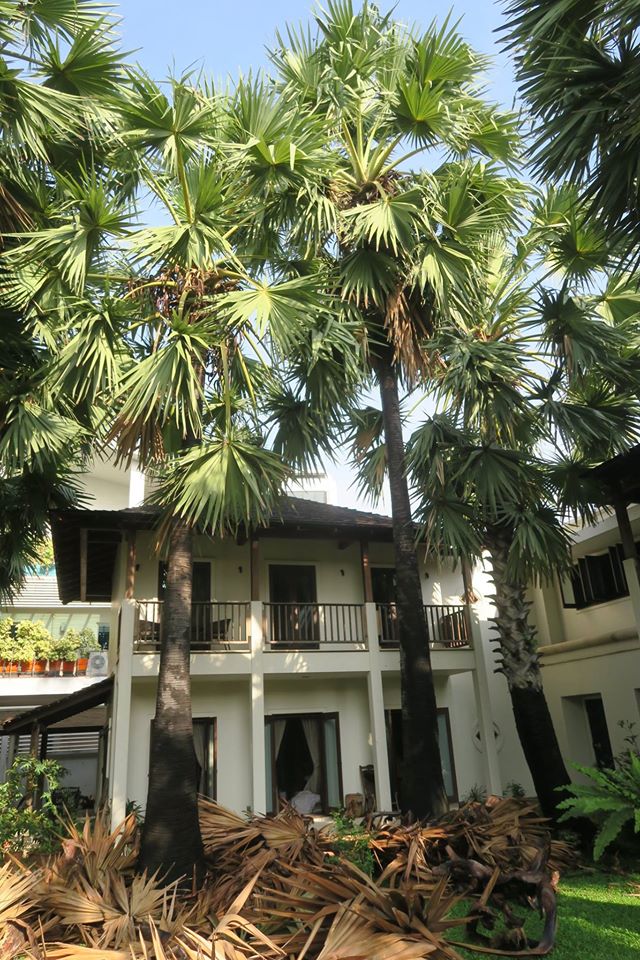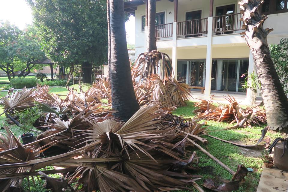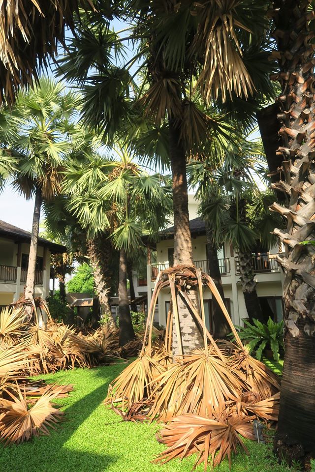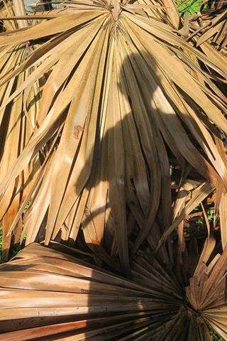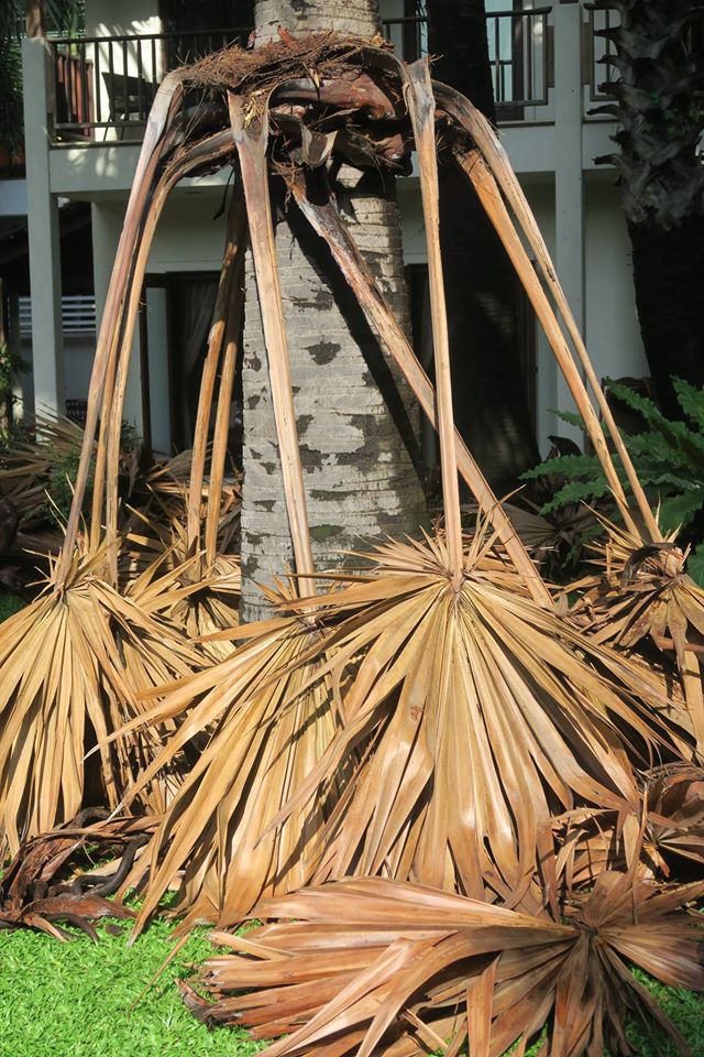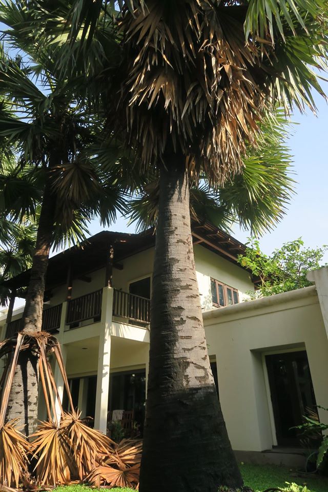 ภาพ ต้นตาล ๑๔ ต้นในลานบ้านกับการตัดแต่งใบแก่ที่ติดเนื่องอยู่กับลำต้น ลักษณะเดียวกับอกุศลที่เป็นเชื้อนอนนิ่งอยู่ในสันดาน พร้อมที่จะรวมกันแล้วหล่นร่วงลงในคราวเดียวมาทับถมถูกผู้คนสิ่งของ ต้องเอาออกไปเสียก่อน เสมอ ๆ