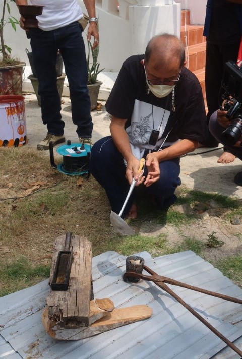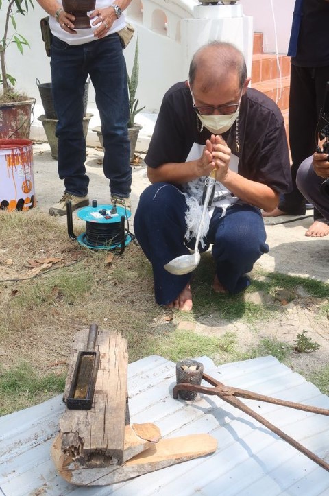 ผมก็ถูกตามลงมาเททอง นาก เงิน ที่เตรียมไว้ ลงในเบ้าหลอมที่ร้อนแดง