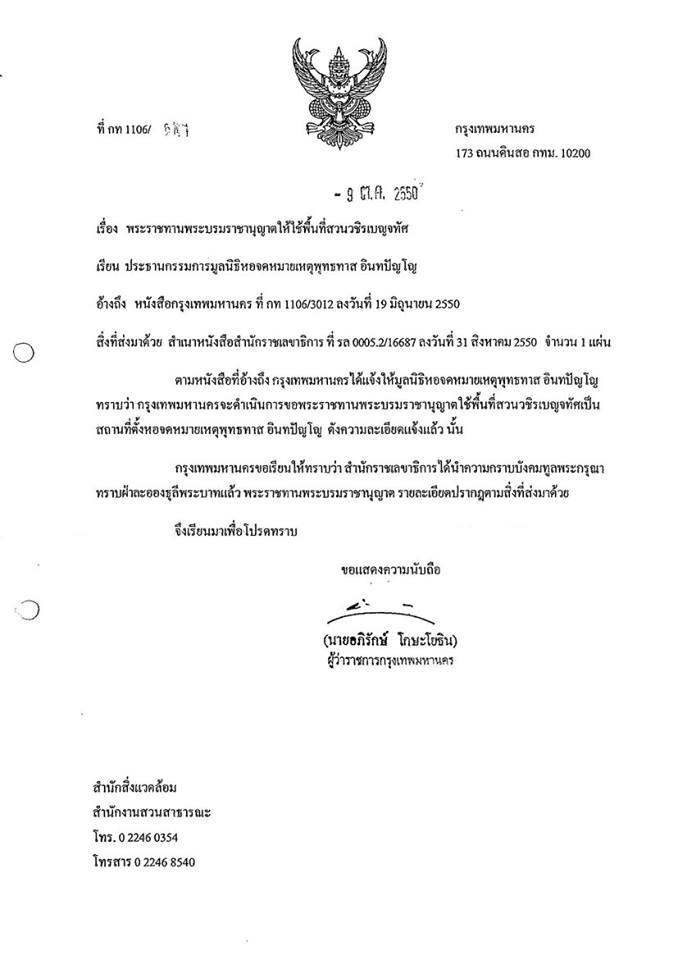 กระทั่งวันที่ ๙ ตุลาคม ๒๕๕๐ หรือเมื่อ ๙ ปี กับ ๕ วันที่แล้ว ก็ได้รับหนังสือจากผู้ว่าฯ กทม.ว่าทรงมีพระบรมราชานุญาตแล้ว