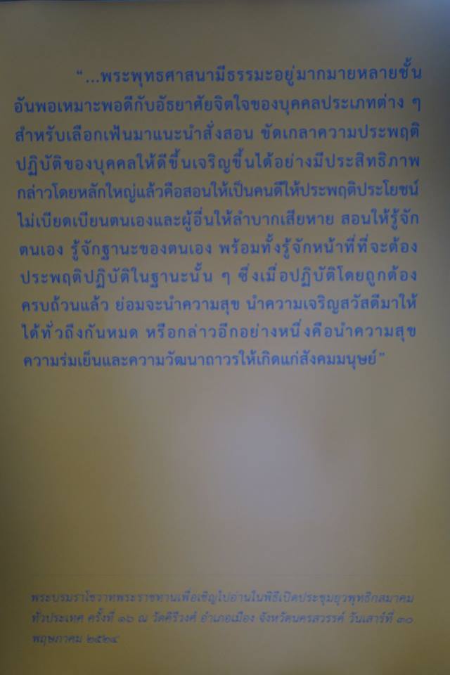"ธรรมะในพระพุทธศาสนานั้นบริบูรณ์ด้วยสัจธรรม ที่เป็นสาระและเป็นประโยชน์ในทุกระดับ...ท่านทั้งหลาย จึงควรจึงควรจะได้เพียรพยายามปฏิบัติส่งเสริมให้มหาชนได้ศึกษาและปฏิบัติธรรมะอย่างถูกต้องทั่วถึง..."