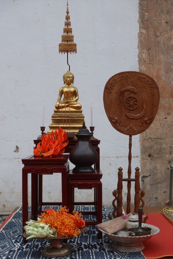 จัดเตรียมที่พระตามสะดวกด้วยสิ่งของที่มีและดอกไม้บานในบ้านวานนี้