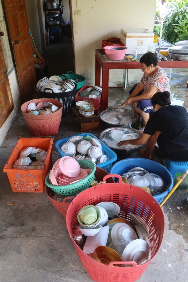 คณะหนึ่ง เอาถ้วยชามวัดออกมาล้าง เตรียมเลี้ยงบุญ