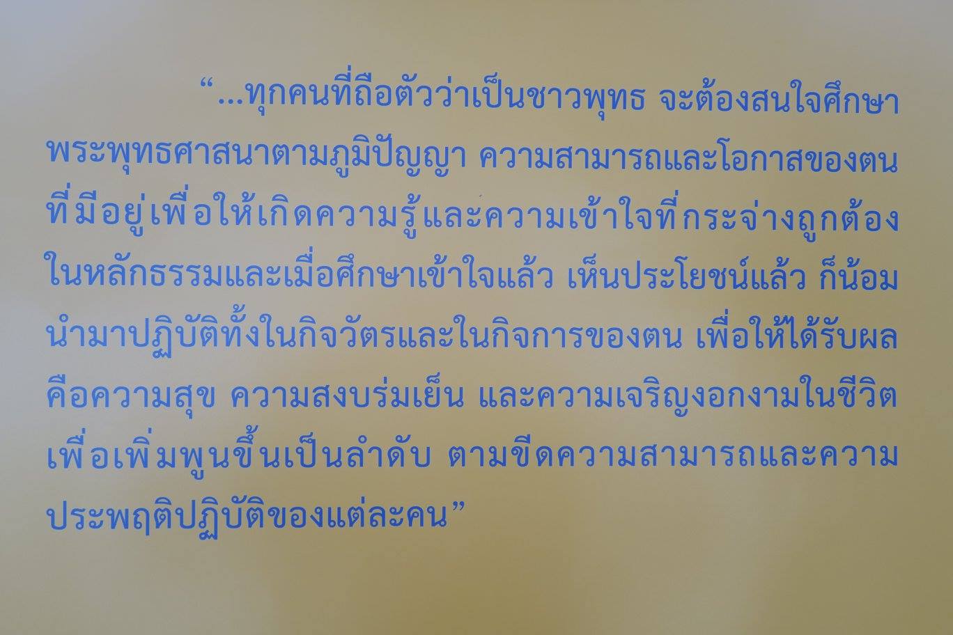 "...ทุกคนที่ถือตัวว่าเป็นชาวพุทธ จะต้องสนใจศึกษาพระพุทธศาสนาตามภูมิปัญญาความสามารถและโอกาสของตนที่มีอยู่ เพื่อให้เกิดความรู้และความเข้าใจที่กระจ่างถูกต้องในหลักธรรม และเมื่อศึกษาเข้าใจแล้ว เห็นประโยชน์แล้ว ก็น้อมนำมาปฏิบัติ ทั้งในกิจวัตรและในกิจการของตน เพื่อให้ได้รับผล คือความสุข ความสงบร่มเย็น และความเจริญงอกงามในชีวิต เพื่อเพิ่มพูนขึ้นเป็นลำดับตามขีดความสามารถและความประพฤติปฏิบัติของแต่ละคน"
