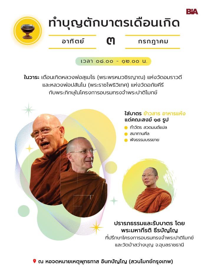 (การร่วมเป็นเจ้าภาพตักบาตร สมทบ ๒,๕๐๐ บาท โดยจะมีส่วนร่วมในการทำบุญสำรับอาหาร หนังสือ ปัจจัยถวายพระ และสนับสนุนการจัดกิจกรรมของหอจดหมายเหตุพุทธทาส อินทปัญโญในเดือนนั้นๆ)