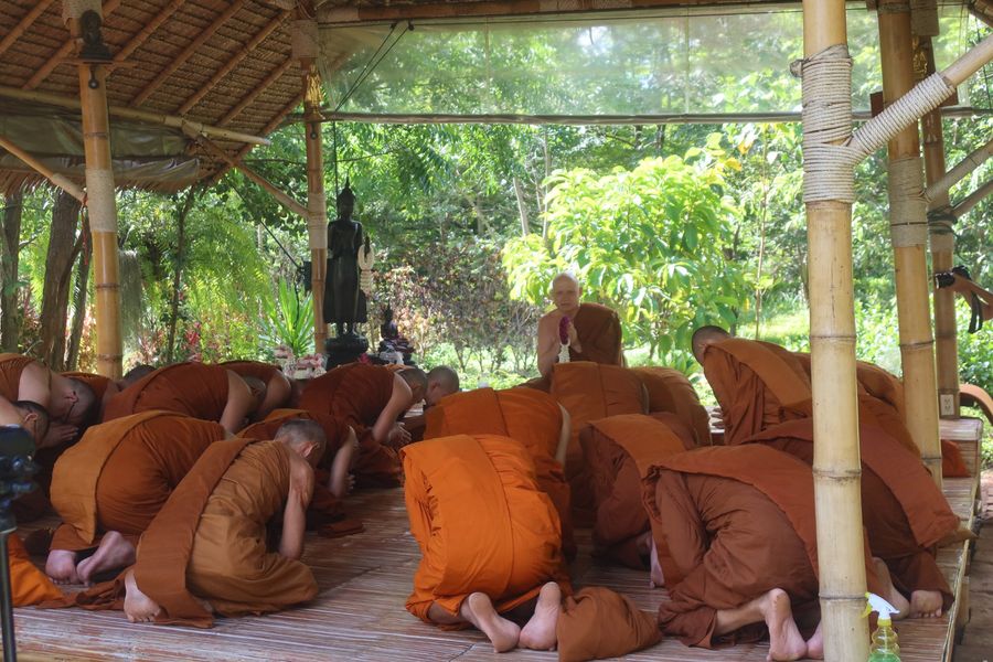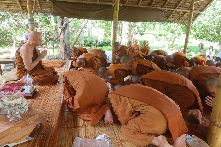 : “ข้าแต่ท่านผู้เจริญ ขอพระเถระจงอดโทษซึ่งความผิดทั้งปวงที่พวกข้าพเจ้าได้กระทำล่วงเกินด้วยความประมาทในพระเถระ ด้วยไตรทวาร”
